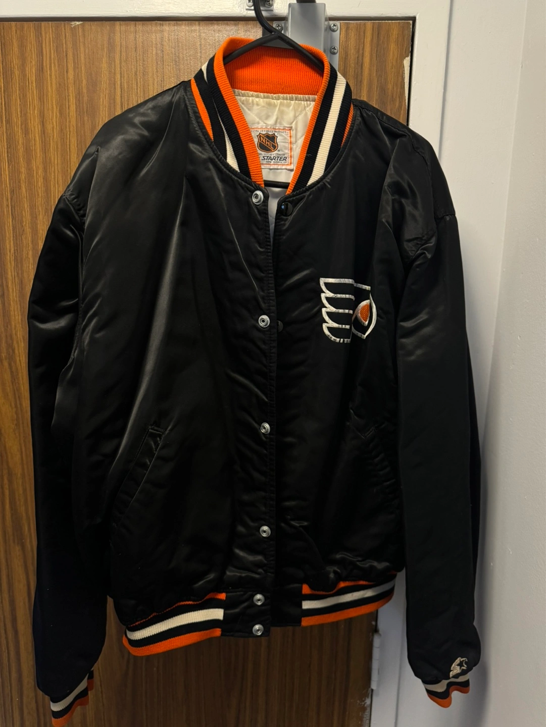Black satin jacket. Features orange and white details. NHL and Flyers logos. Starter brand. Pet and smoke free house