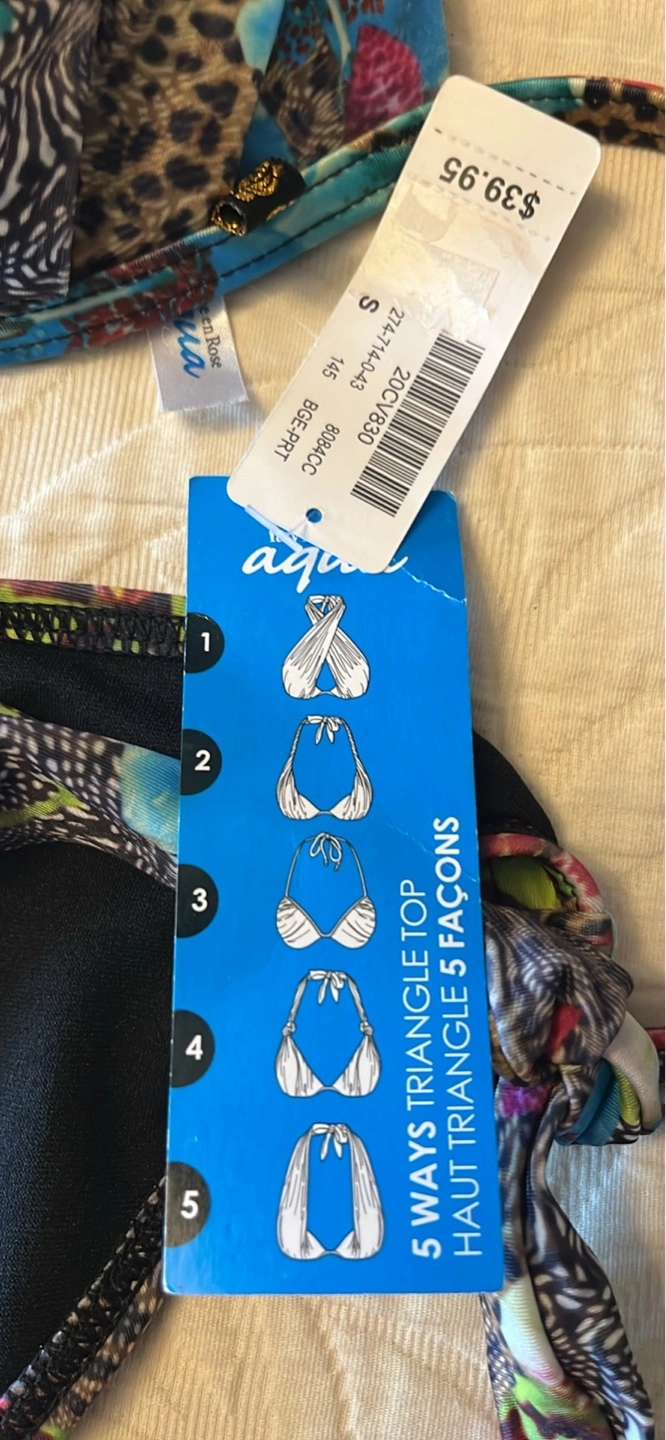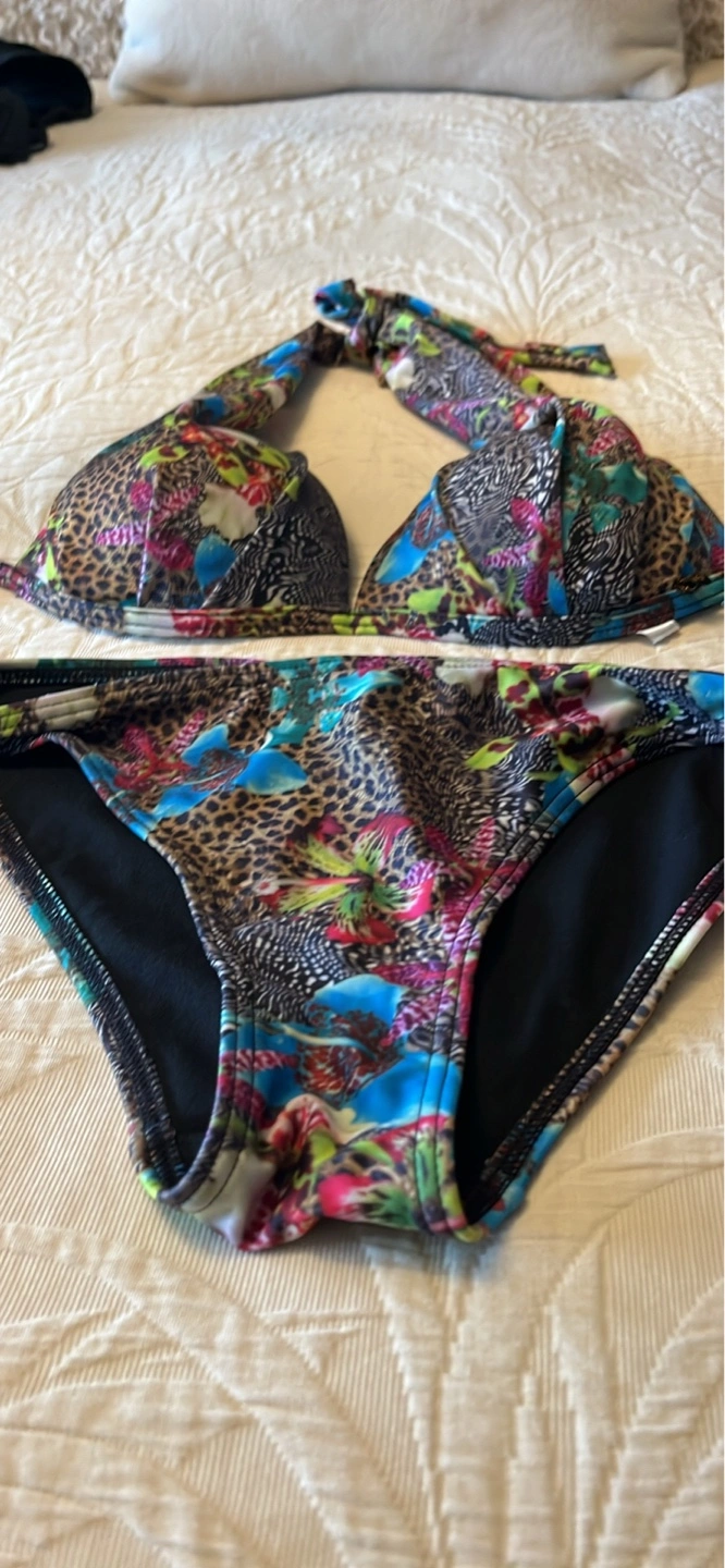 Bottom medium. Top small. Multicoloured animal print. Triangle top, five ways to wear. Matching bottoms. New with tags. Brand new.