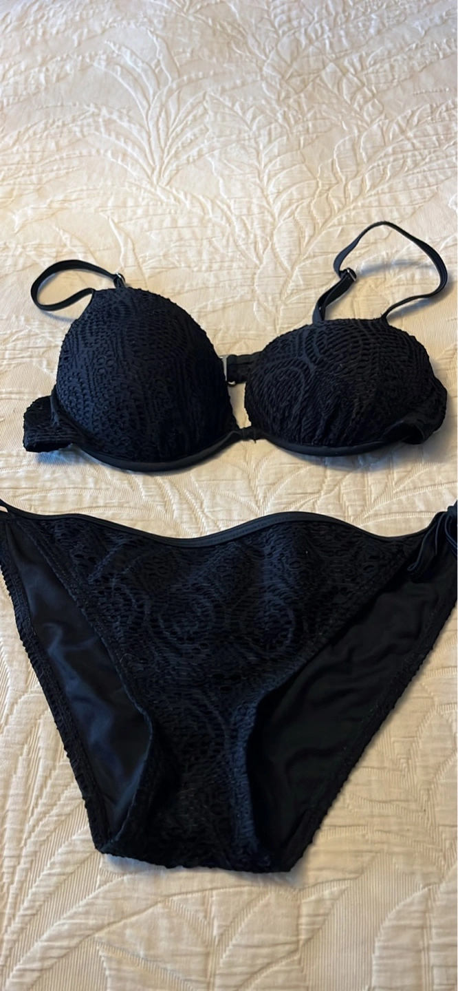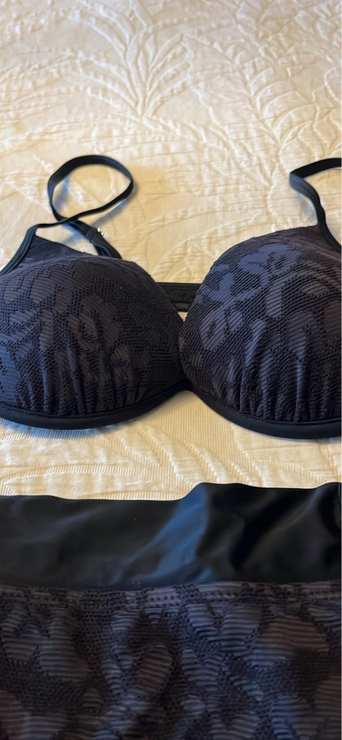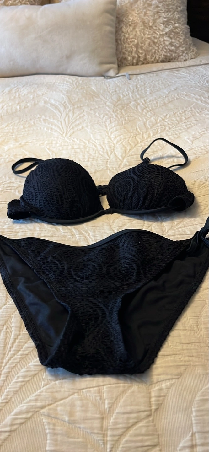Women's black bikini. Features a textured lace pattern. Underwire top with adjustable straps. Low-rise bottoms with side ties. Perfect for summer. Size small. Smoke and pet free home. Pick up in Stittsville.
