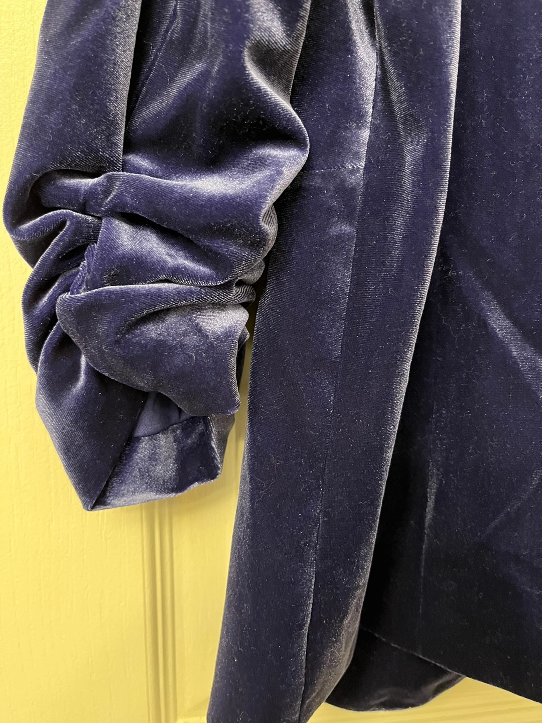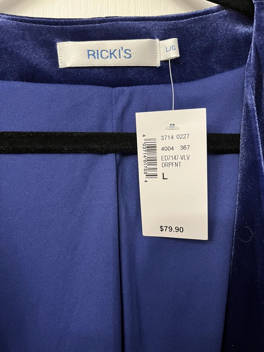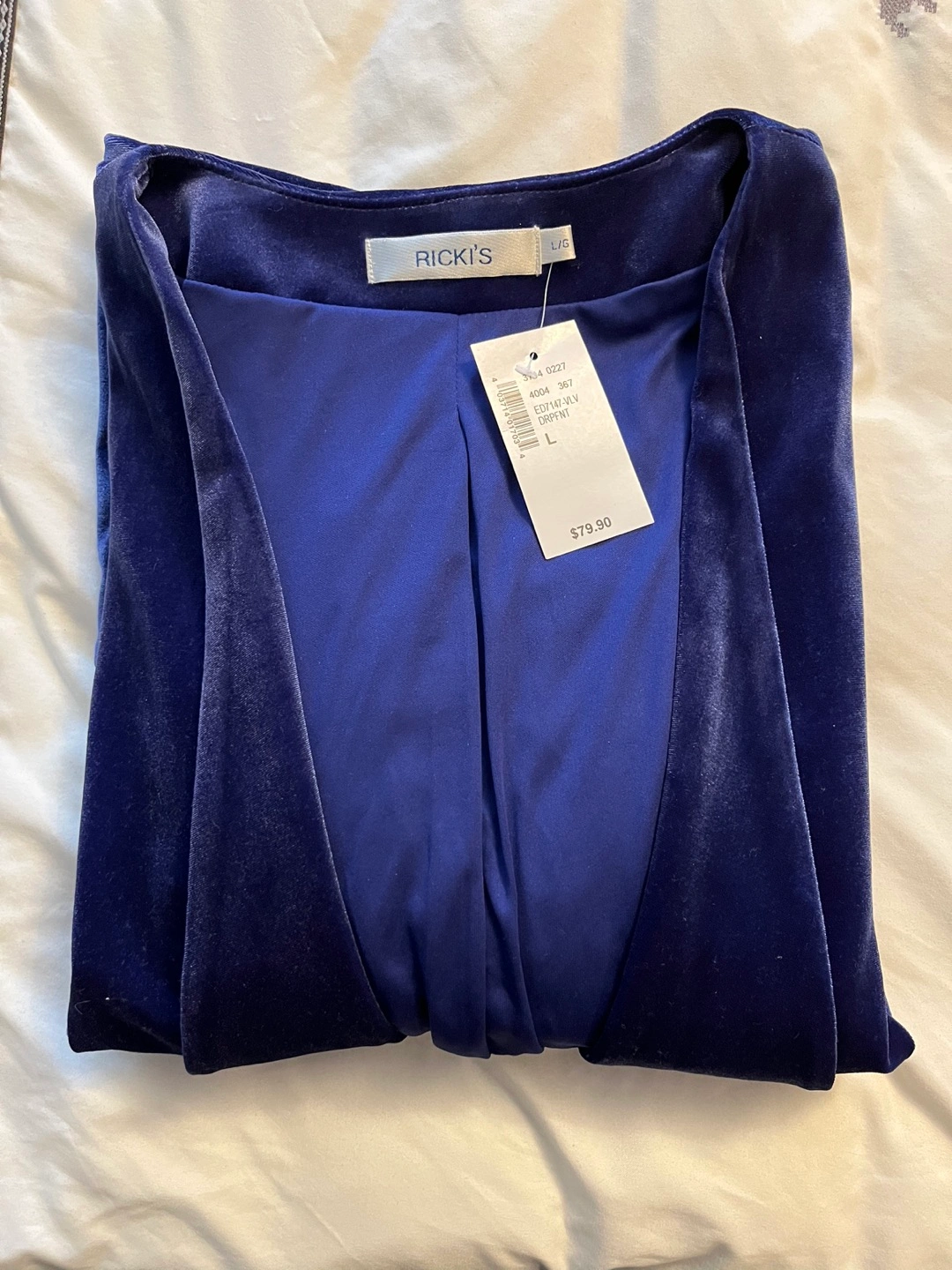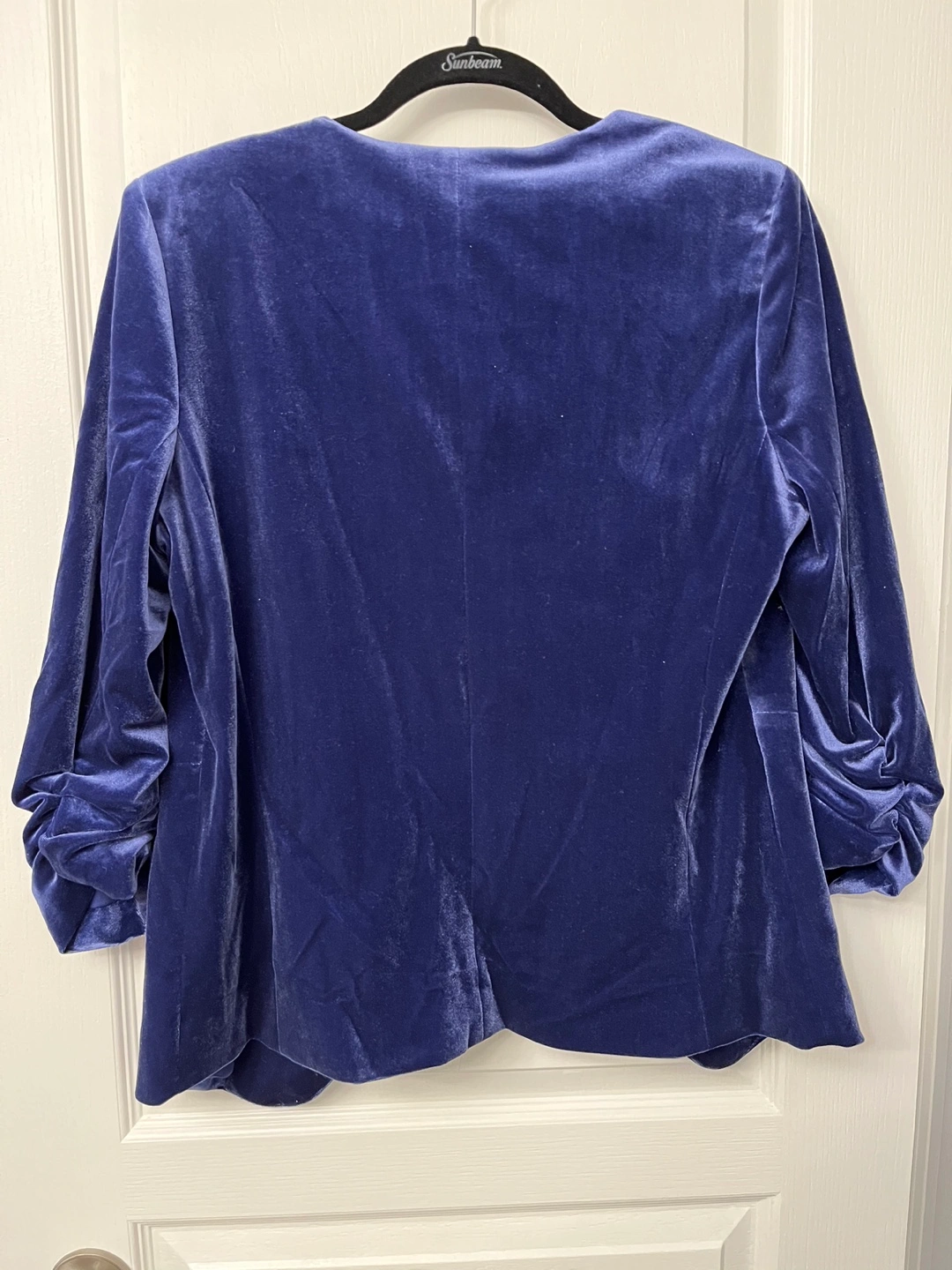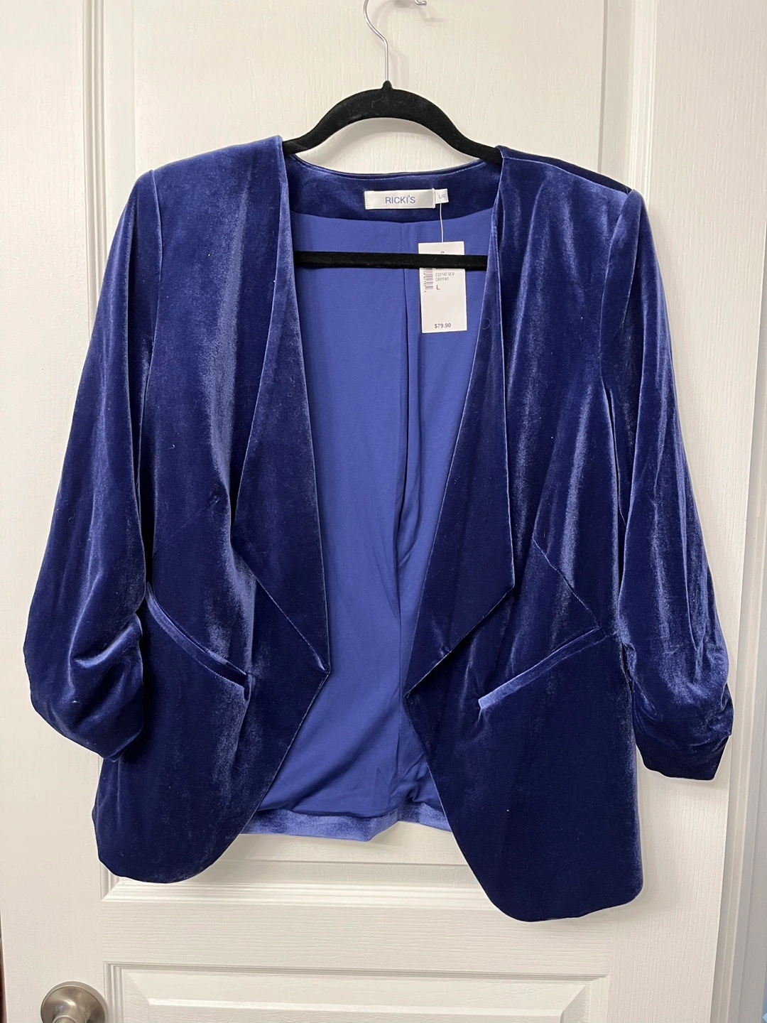 Brand New w/tags. Ricki’s open front velvet purple ladies blazer. Size Large. 3/4 sleeve with ruching details. Can be easily dressed up or down. Fabric is velvet with stretch. Fully lined.