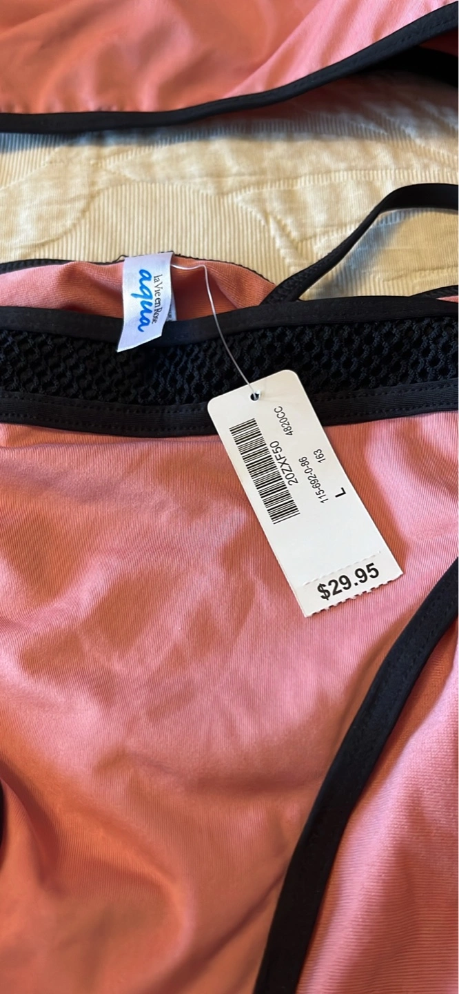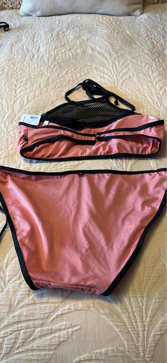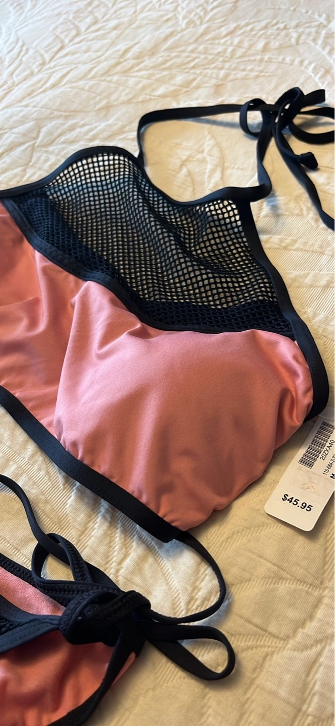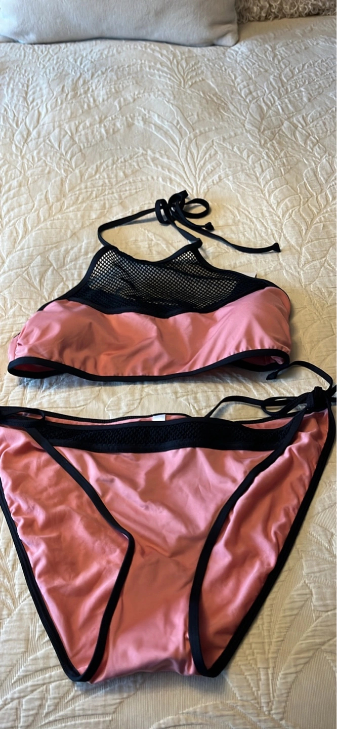 Two-piece bikini. Dusty rose colour with black accents. Halter neck top features mesh detailing. Large bottom. Medium top. Regular $75. New with tags.