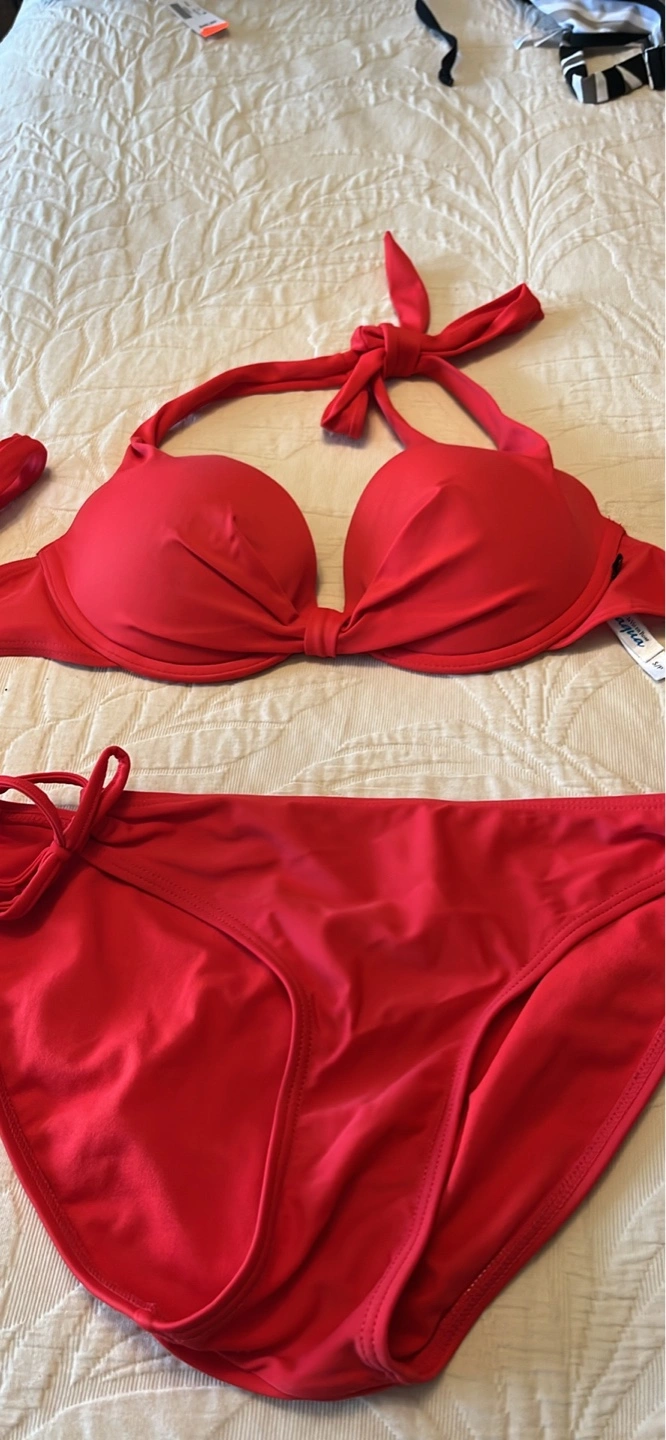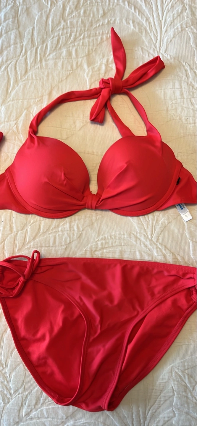 Gorgeous red bikini. Halter top with a twist detail. Matching low-rise bottoms with tie sides. Excellent condition. Size small.