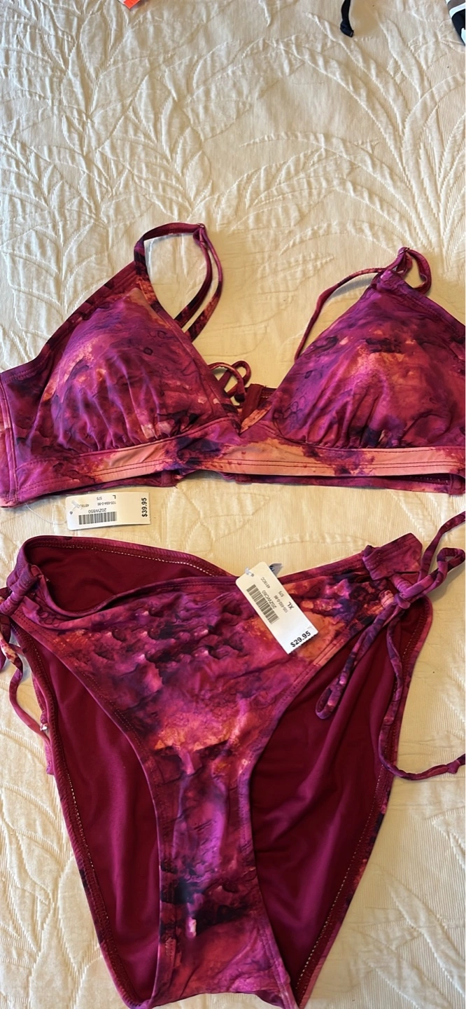 Brand new Ambra bikini. Features a tie-dye print and lace-up back detail. Brand New. Bottom X-Large. Top Large. Smoke & pet free home. Includes a top and bottom. Perfect for summer! Brand new regular $70.