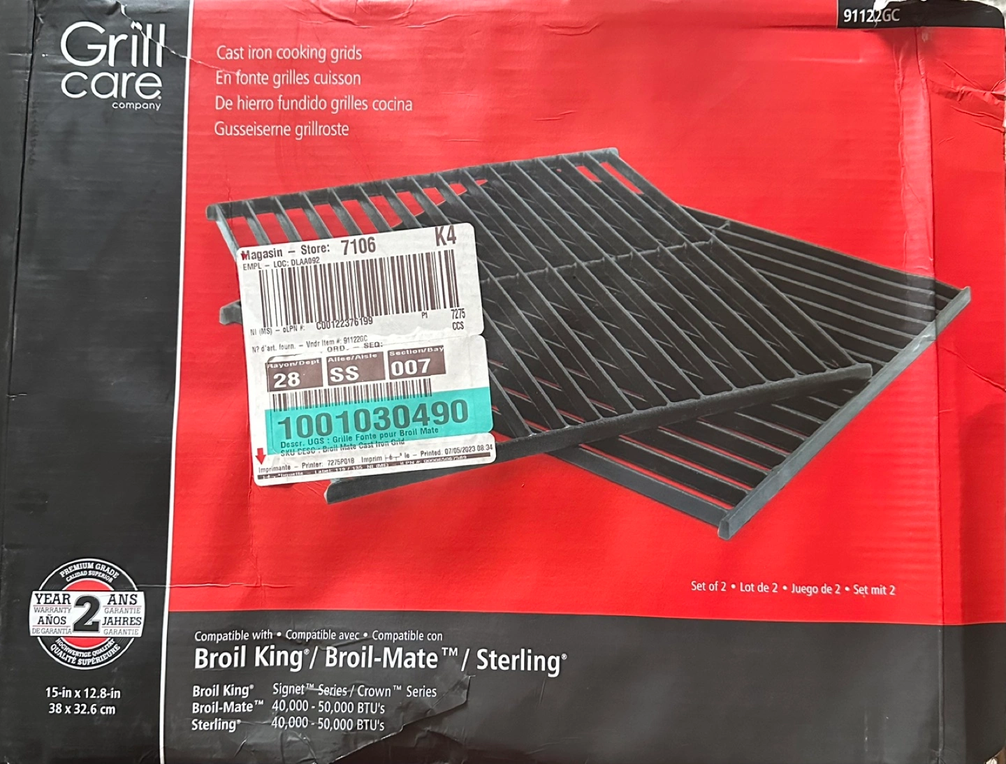 Brand New- Set of two cast iron cooking grids. Compatible with Broil King Signet/Crown series and Broil-Mate/Sterling grills. 40,000-50,000 BTUS. Measures 15 x 12.8 inches.