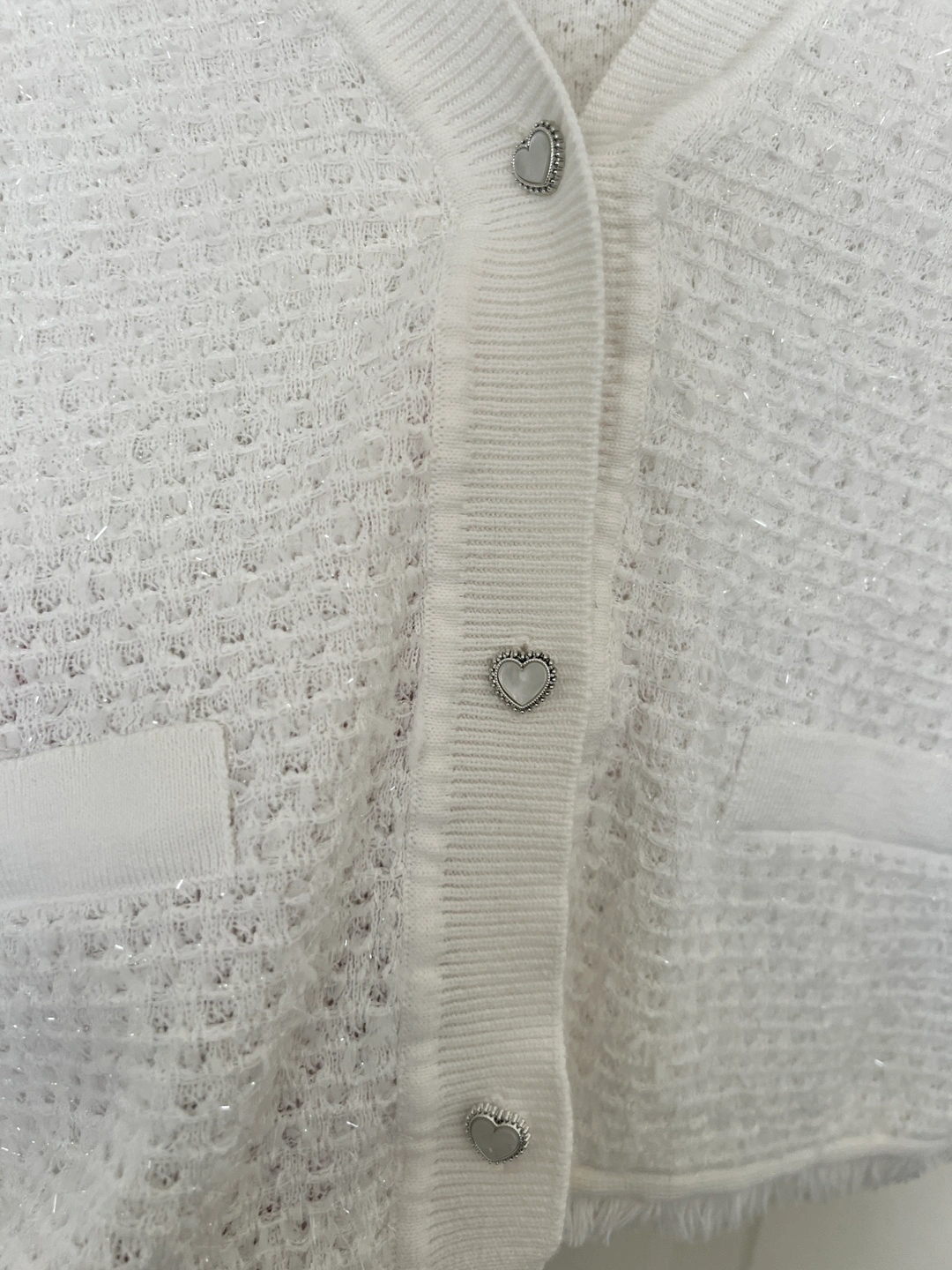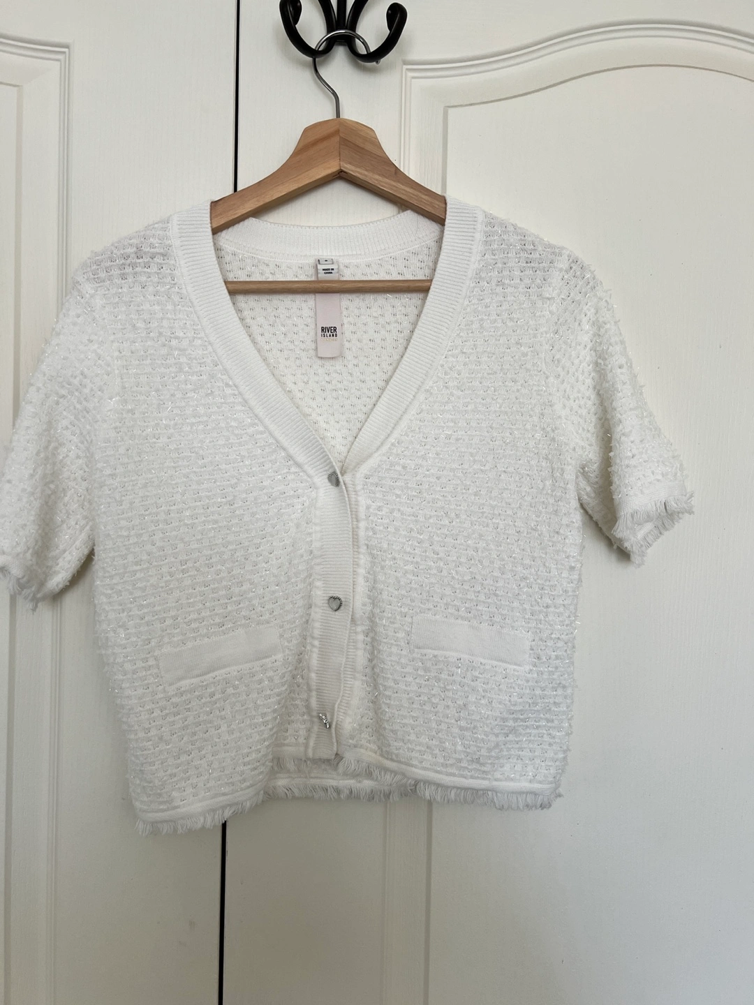 143From London. Adorable white cropped cardigan. Short sleeves, button front, and frayed hem. Features small heart-shaped buttons. New condition. Euro size 8= size small here.