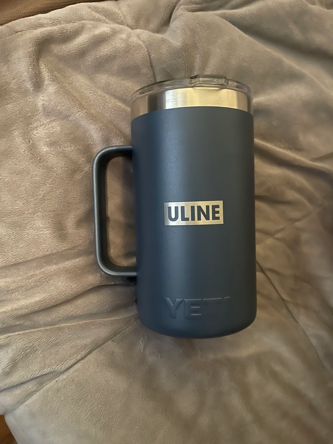 24 ounce YETI mug. Navy blue colour. Features a large, sturdy handle. Double-wall vacuum insulated stainless steel. Magnetic slider snaps shut to reduce spills. Dishwasher safe. Uline branding on the mug.