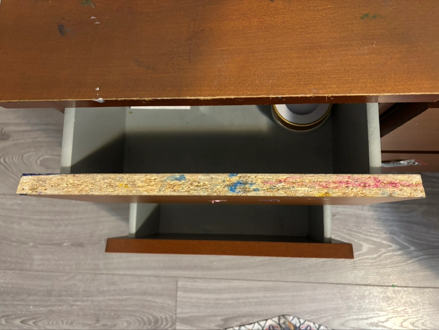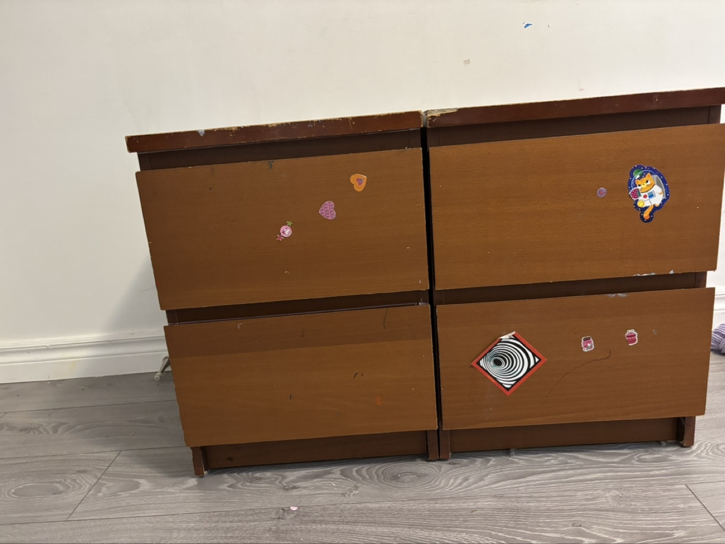 Two brown wooden nightstands. Two drawers each. Some minor wear and tear, including stickers and paint marks. Solid wood construction. Ideal for a child's room or as a project.