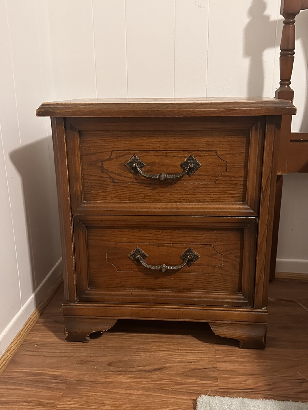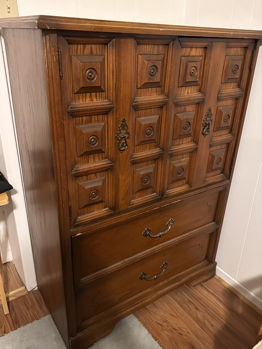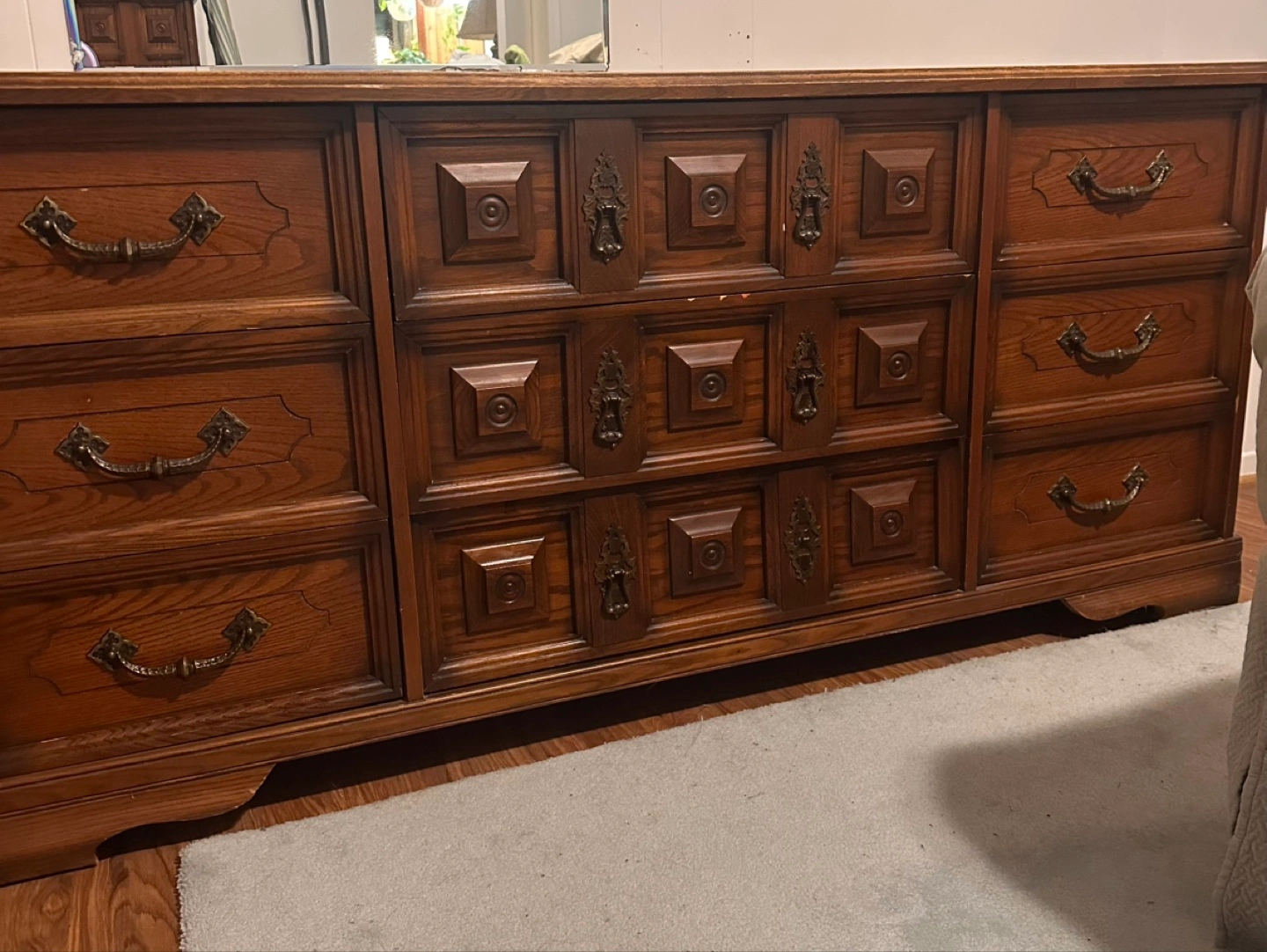 Beautiful vintage bedroom set. Includes a tall armoire with two drawers, a large dresser with multiple drawers, a headboard, and a nightstand. Dark brown wood finish. Solid wood. Some minor wear and tear consistent with age.