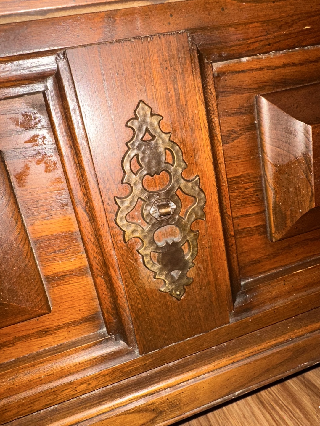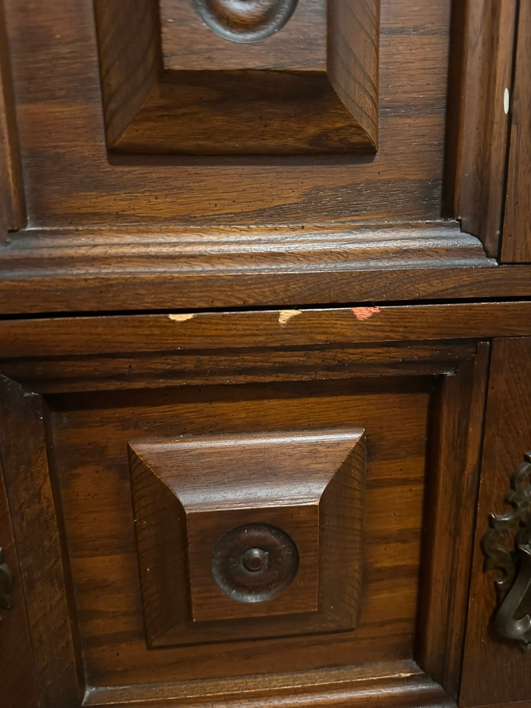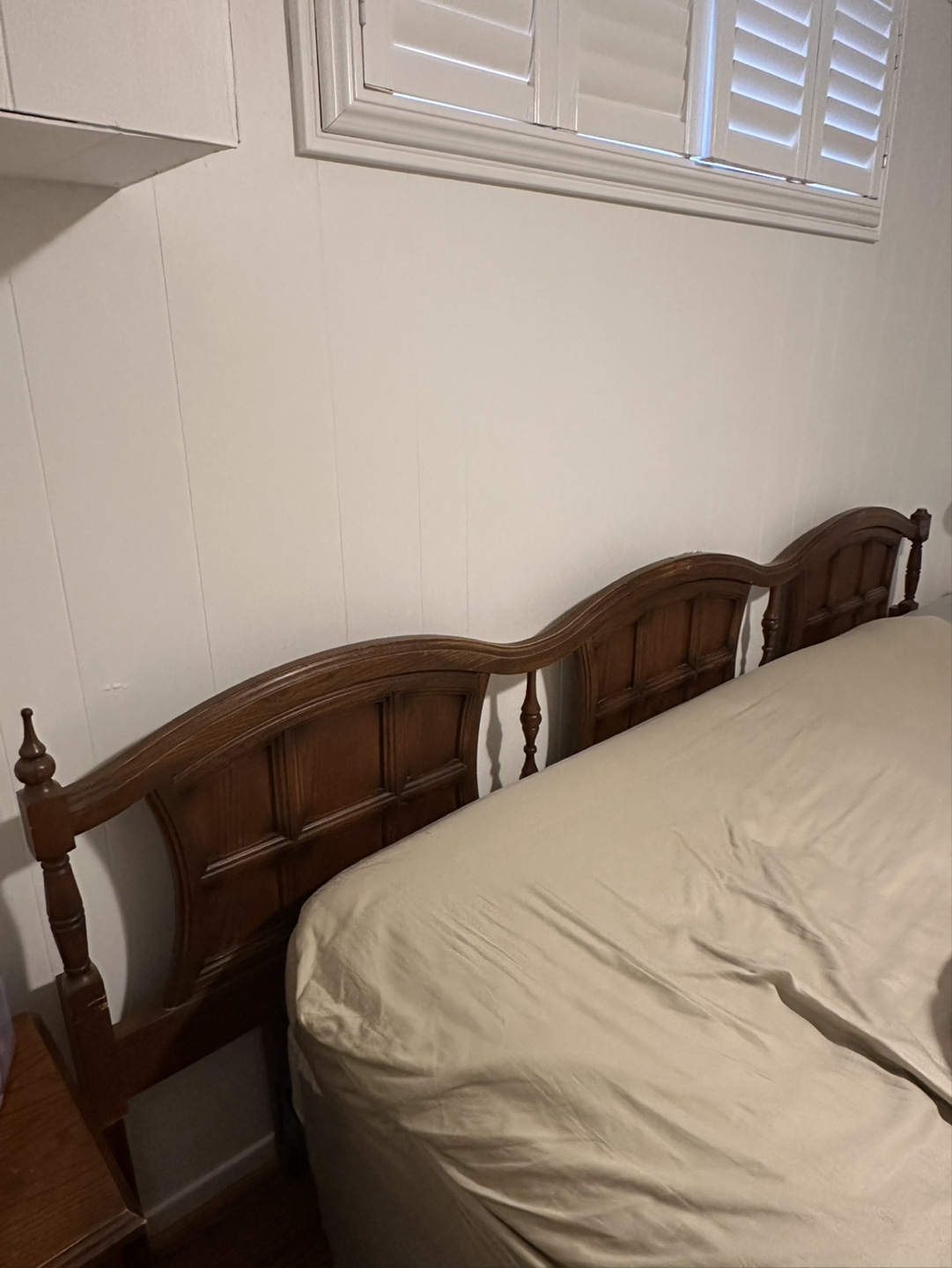 Beautiful vintage bedroom set. Includes a tall armoire with two drawers, a large dresser with multiple drawers, a headboard, and a nightstand. Dark brown wood finish. Solid wood. Some minor wear and tear consistent with age.