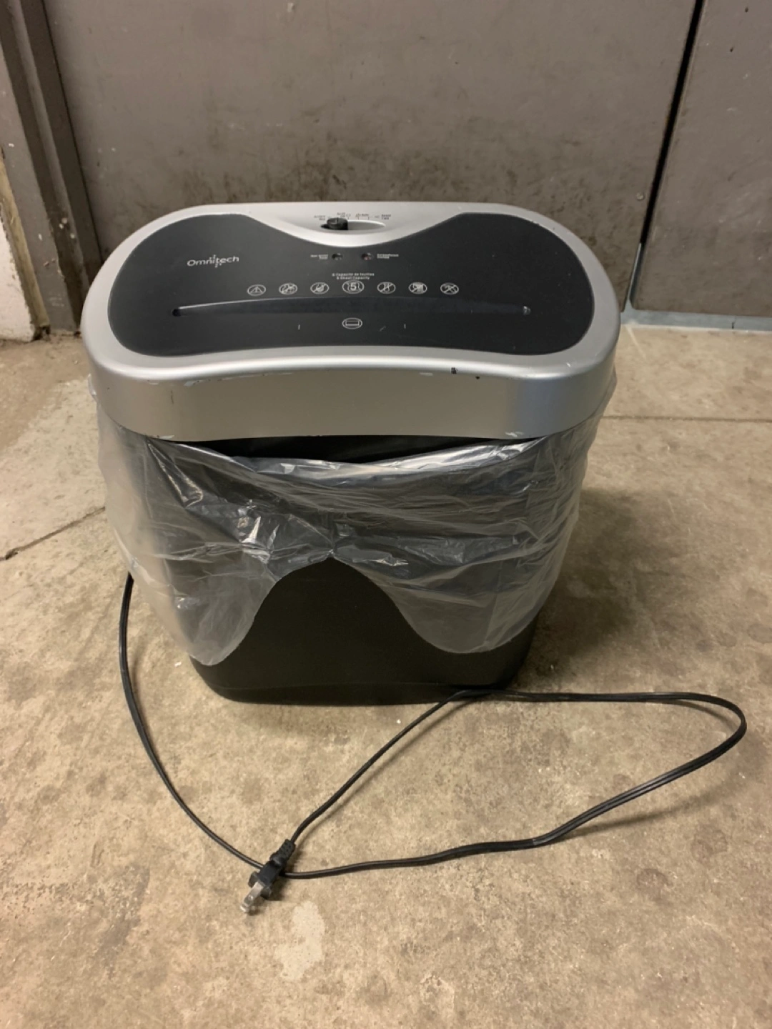 Omnitech paper shredder. 5-sheet capacity. Features reverse function. Includes power cord. Used condition.