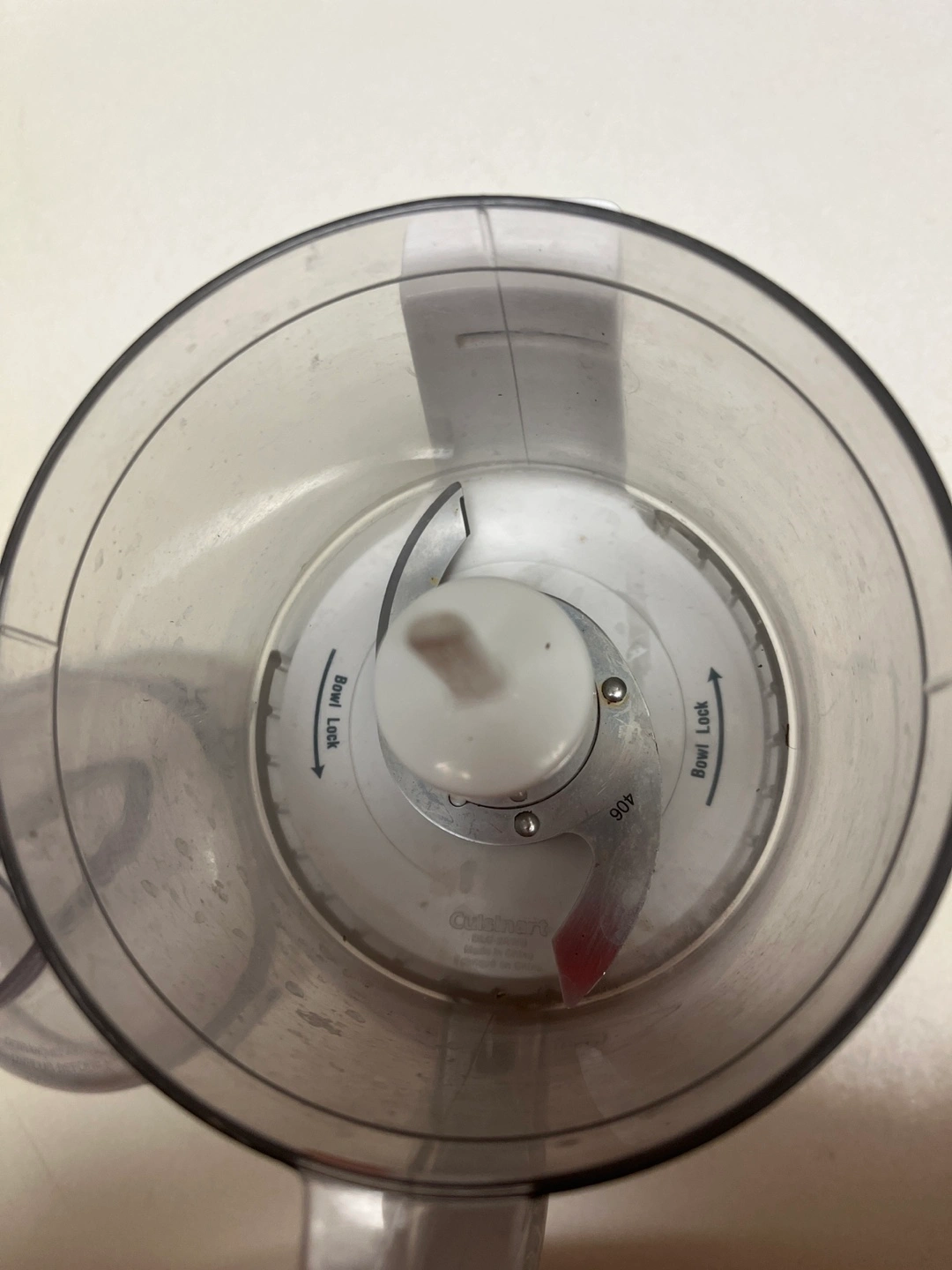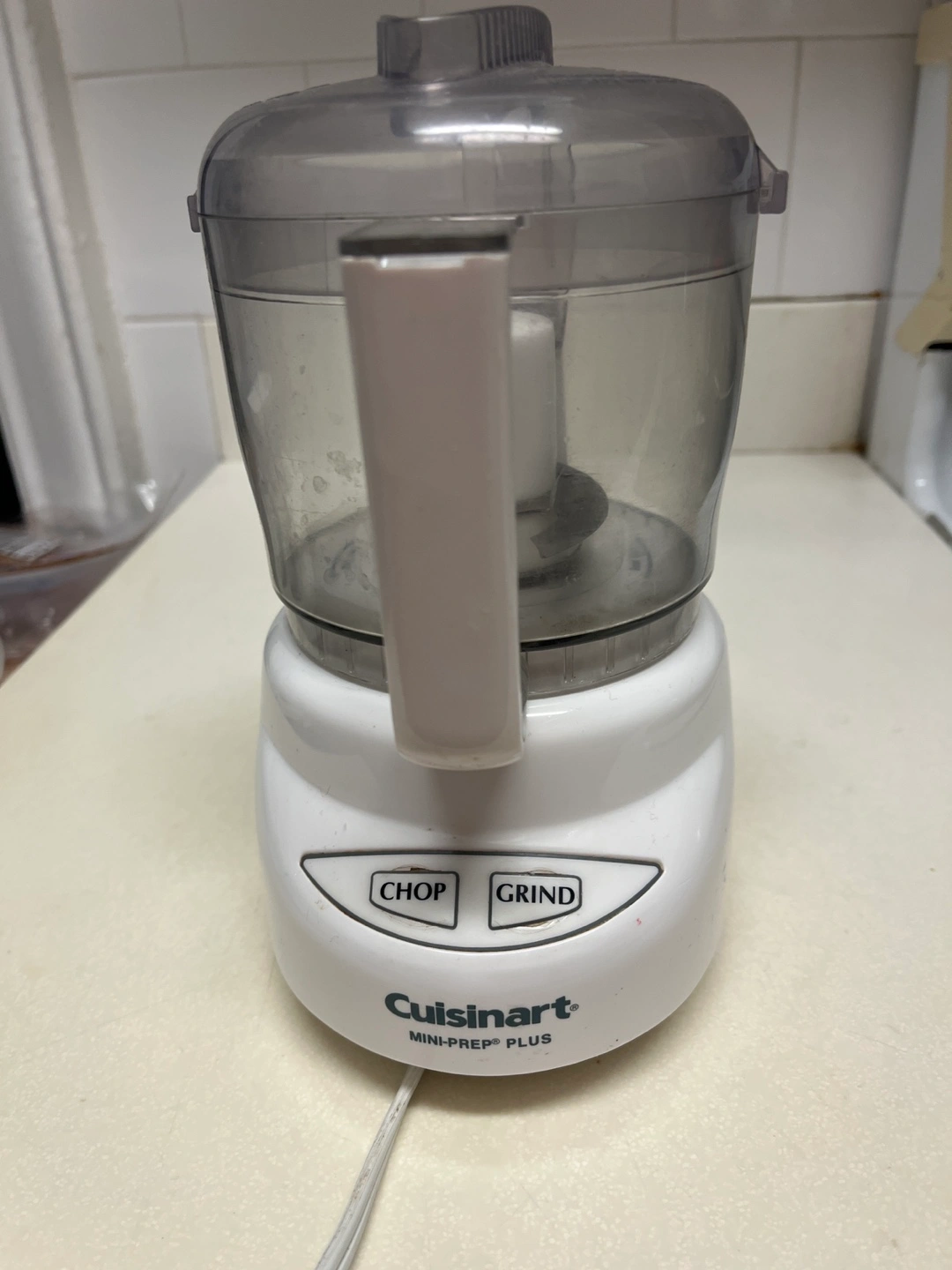 Small electric food chopper. Chop and grind functions. Clear plastic bowl. White base. Used condition.