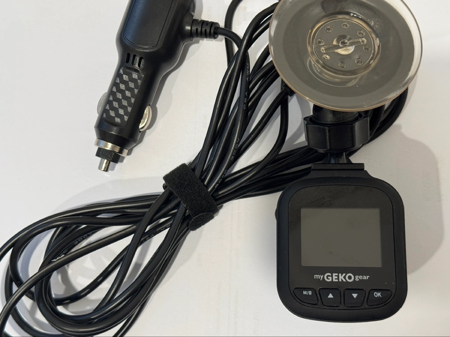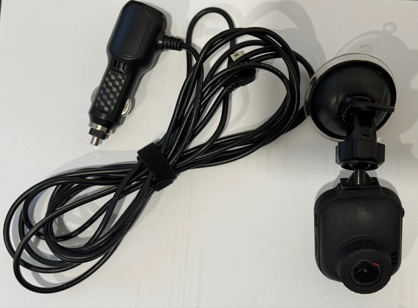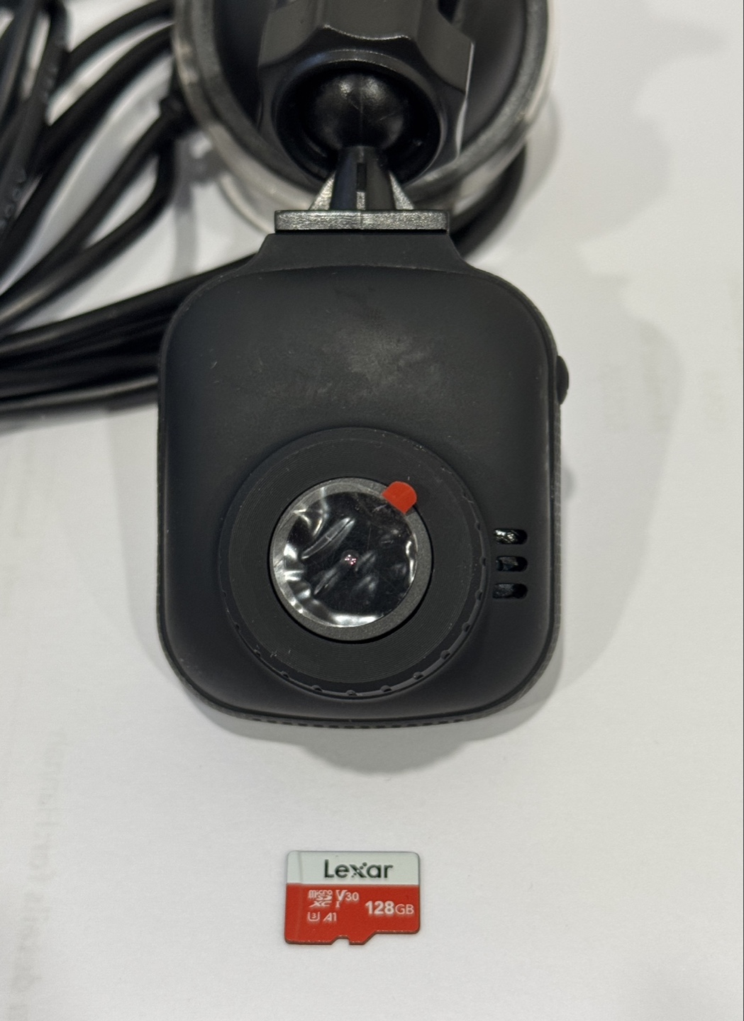 Used dashcam with car charger and suction cup mount.