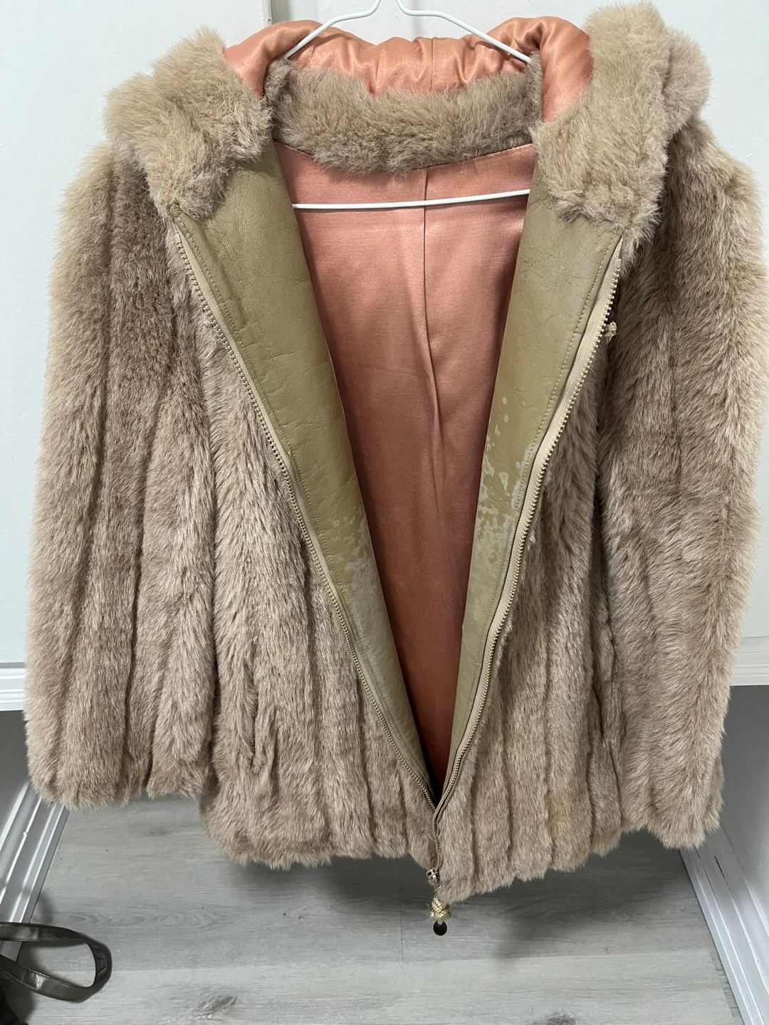 Women's beige faux fur jacket. Features a hood and zip closure. Soft material. Some minor stains visible.