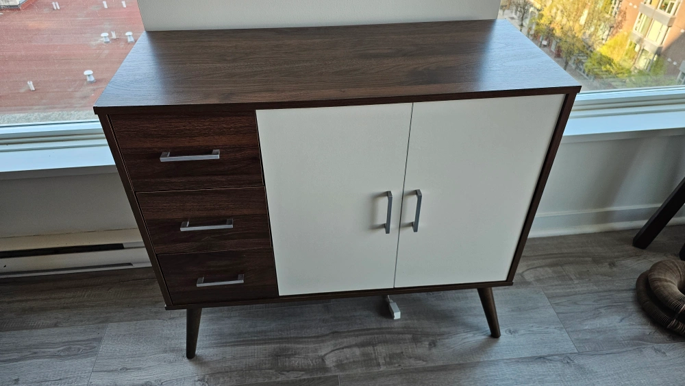 Stylish two-tone cabinet with three drawers and two soft close doors. Dark brown wood-look top and white doors - mcm style. Minor water damage on top but excellent condition otherwise.