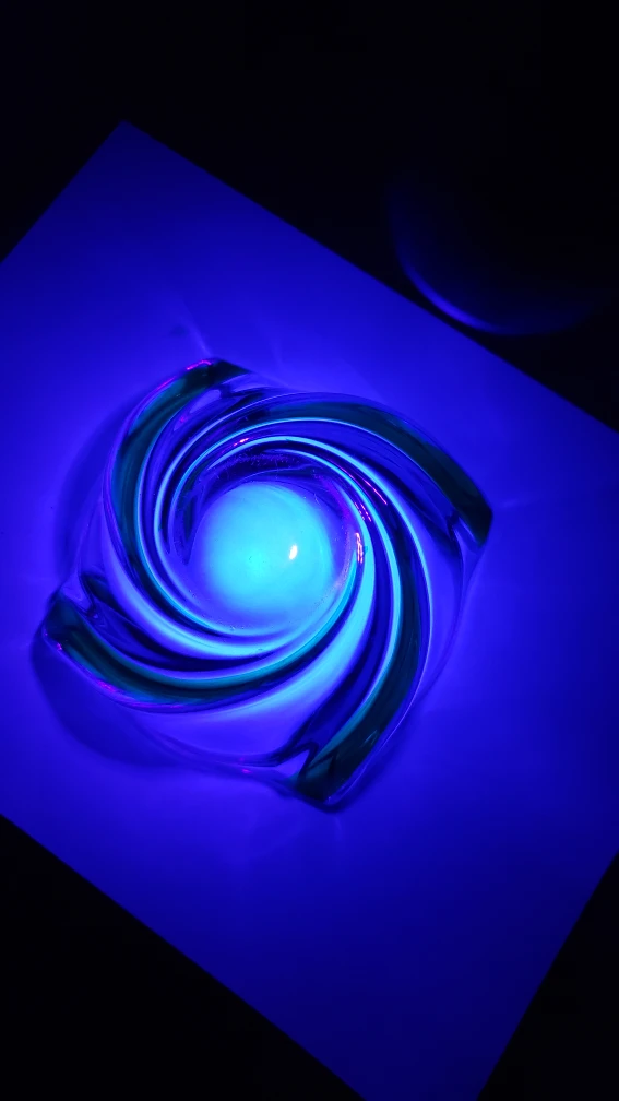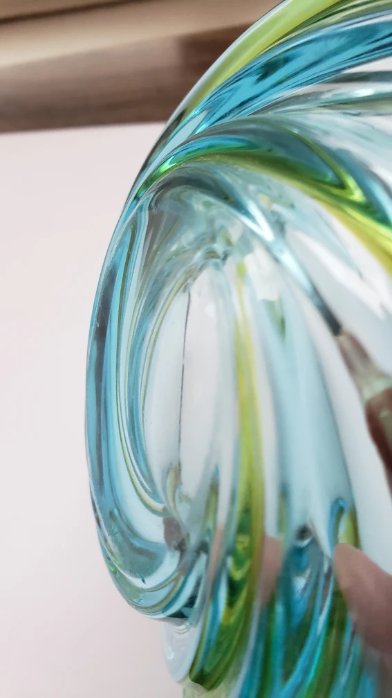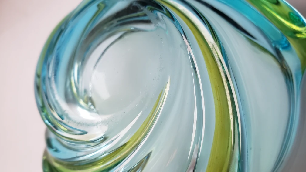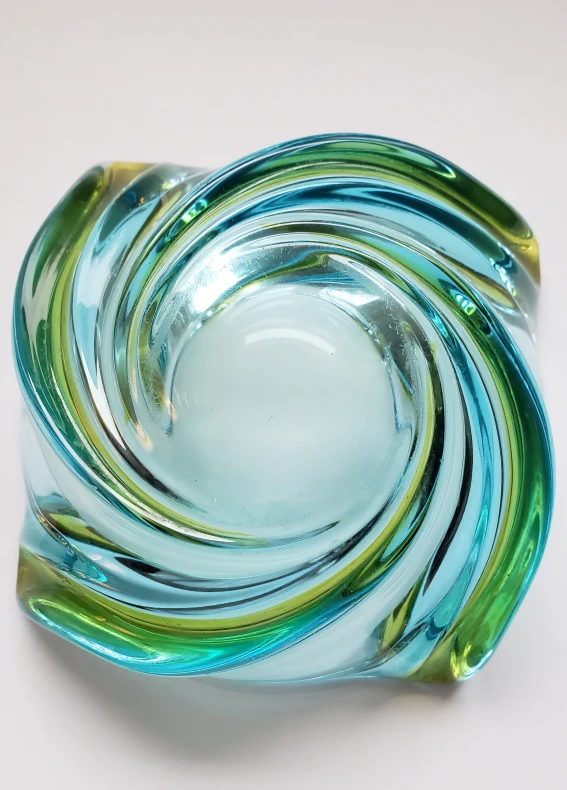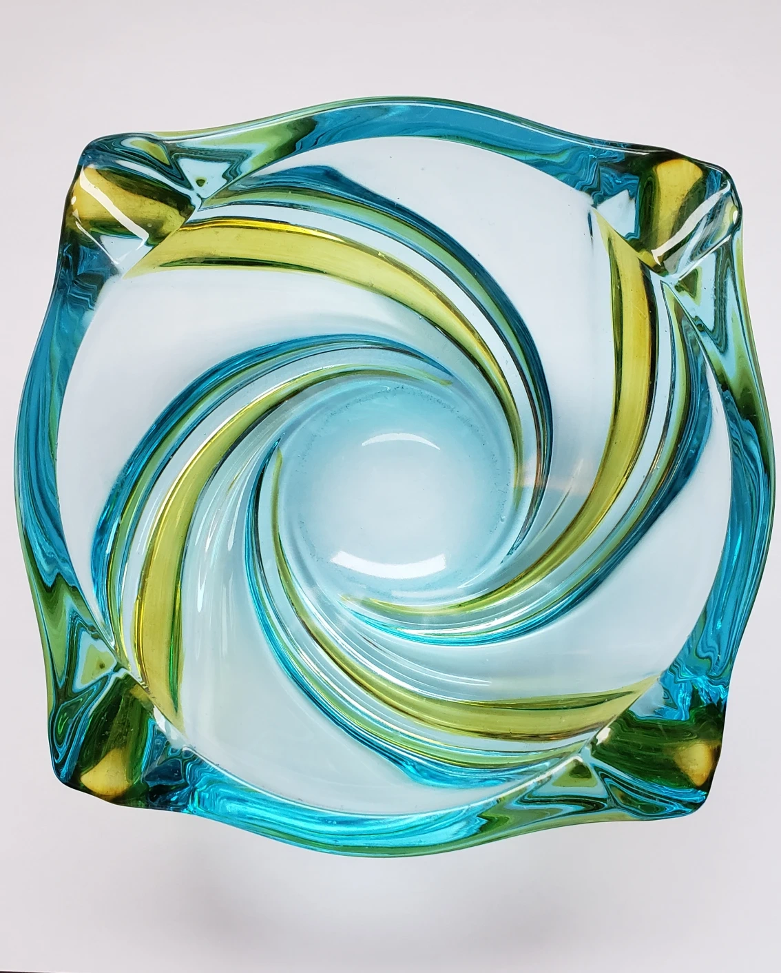 Beautiful vintage ashtray. Swirling design. Teal, light blue and yellow-green colours. Glass construction. Unique piece for a collector.