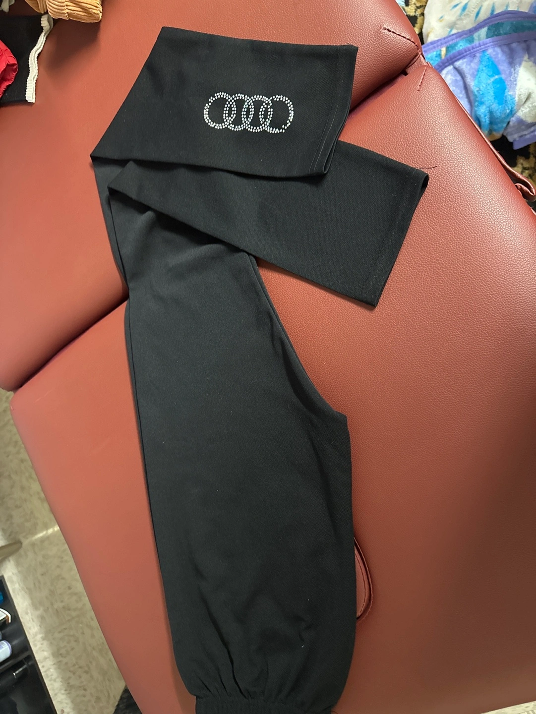 Black leggings featuring an Audi logo in rhinestones. Elastic waistband. Great for casual wear.