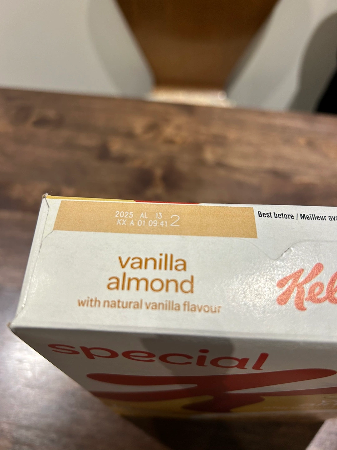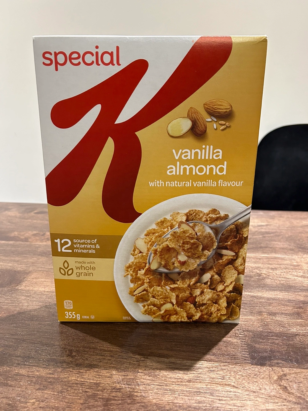 355g box of vanilla almond cereal. Made with whole grain. Source of 12 vitamins and minerals. Natural vanilla flavour.