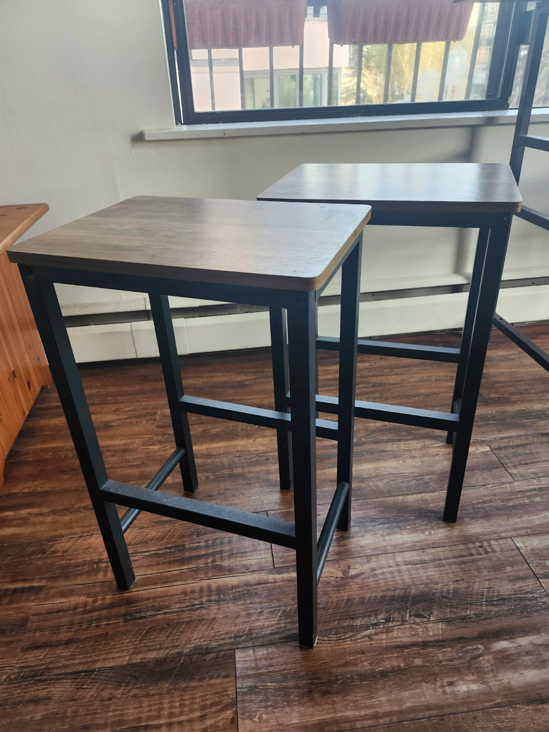 Two stools, modern design, black metal frame, dark wood top, great condition, ideal for kitchen counter, bar height table, or as plant stands.