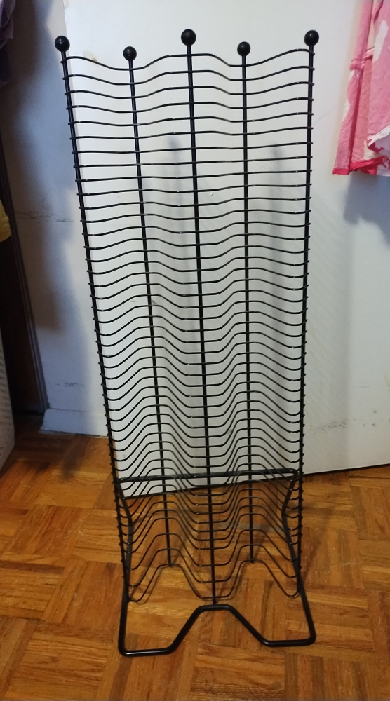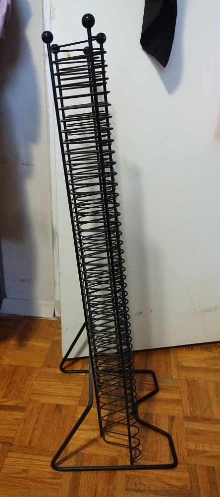 Black metal CD storage rack. Holds many discs. Freestanding design. Great for organizing your collection.