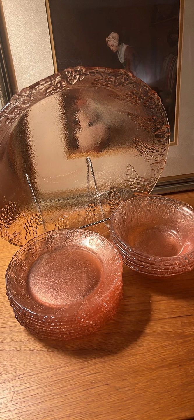 Lovely vintage pink depression glass grape serving set. Includes a large serving bowl.8 dessert plates, and 4 small bowls. All pieces feature a textured grape design.
