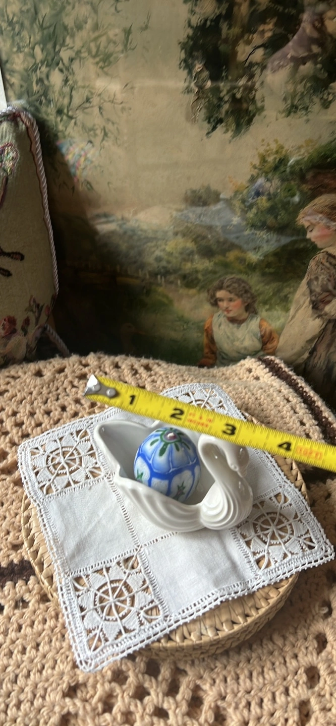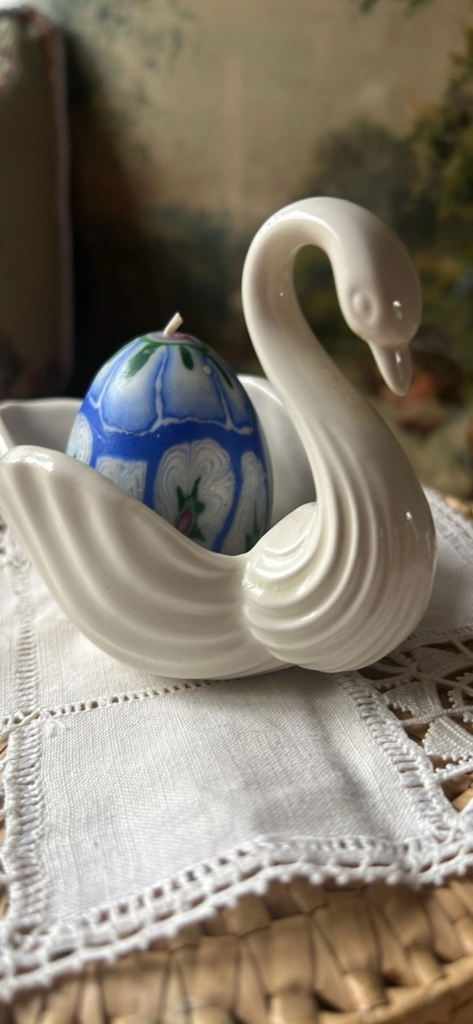 Adorable vintage swan-Features a small, decorative egg candle. White ceramic. Approximately 4 inches long.