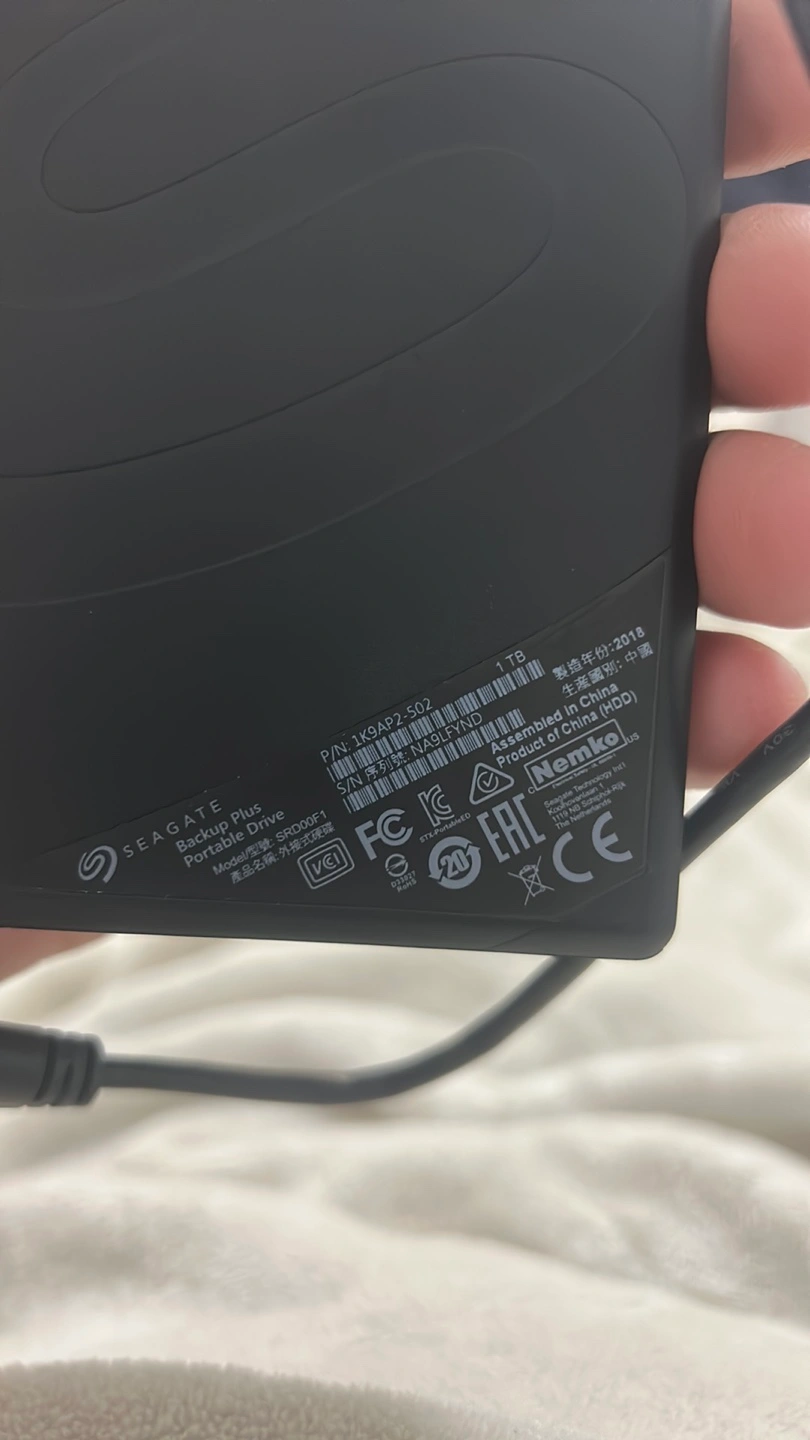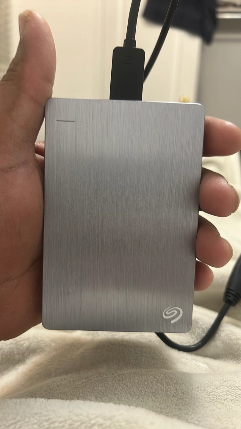 Silver portable external hard drive. Compact and lightweight design. Includes USB cable. Used, but in good condition.