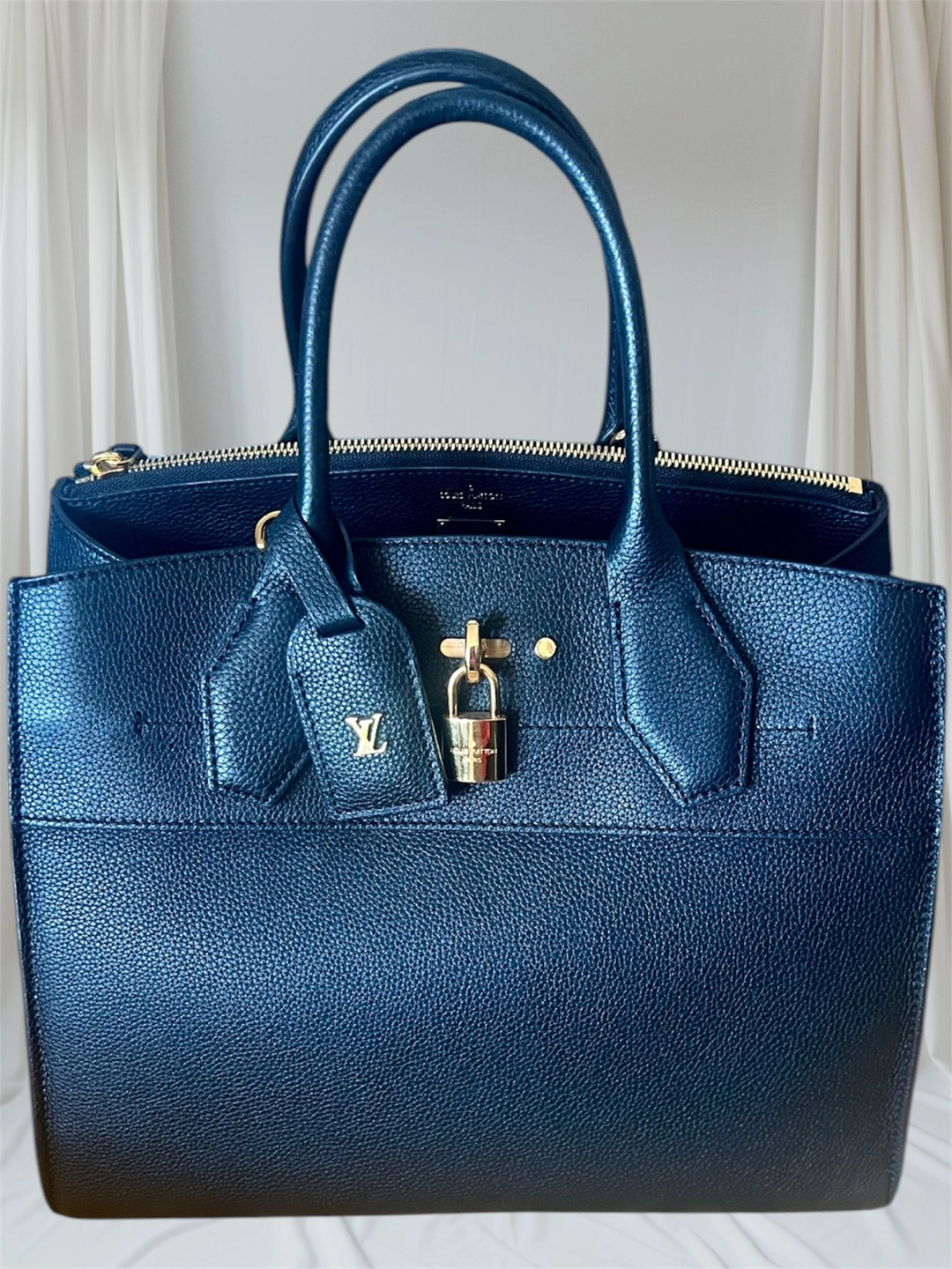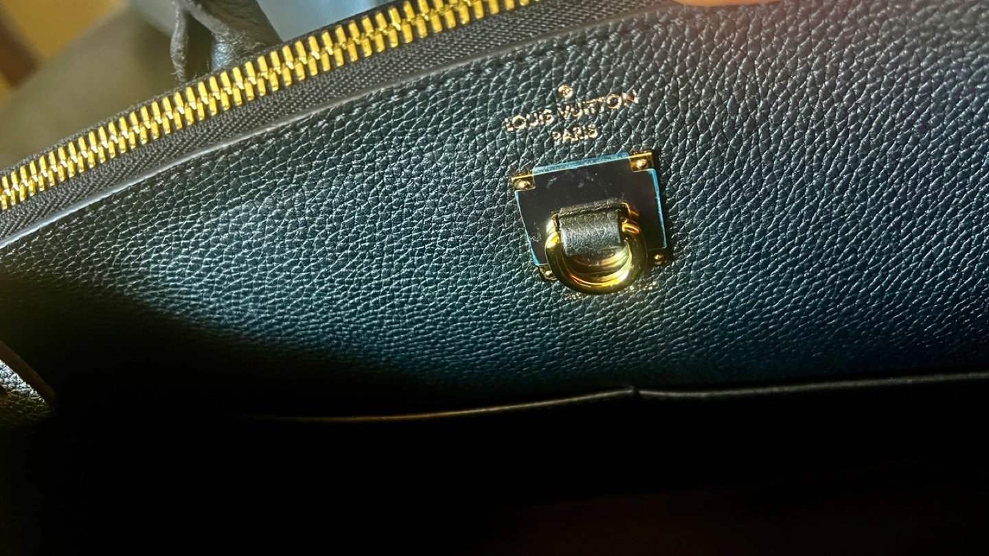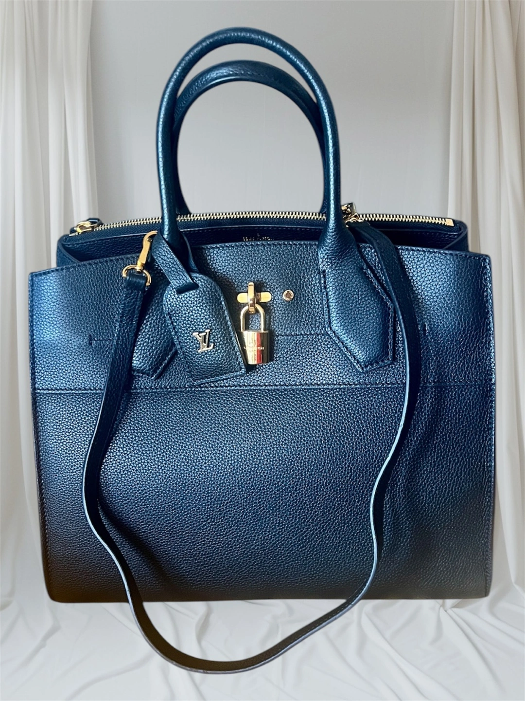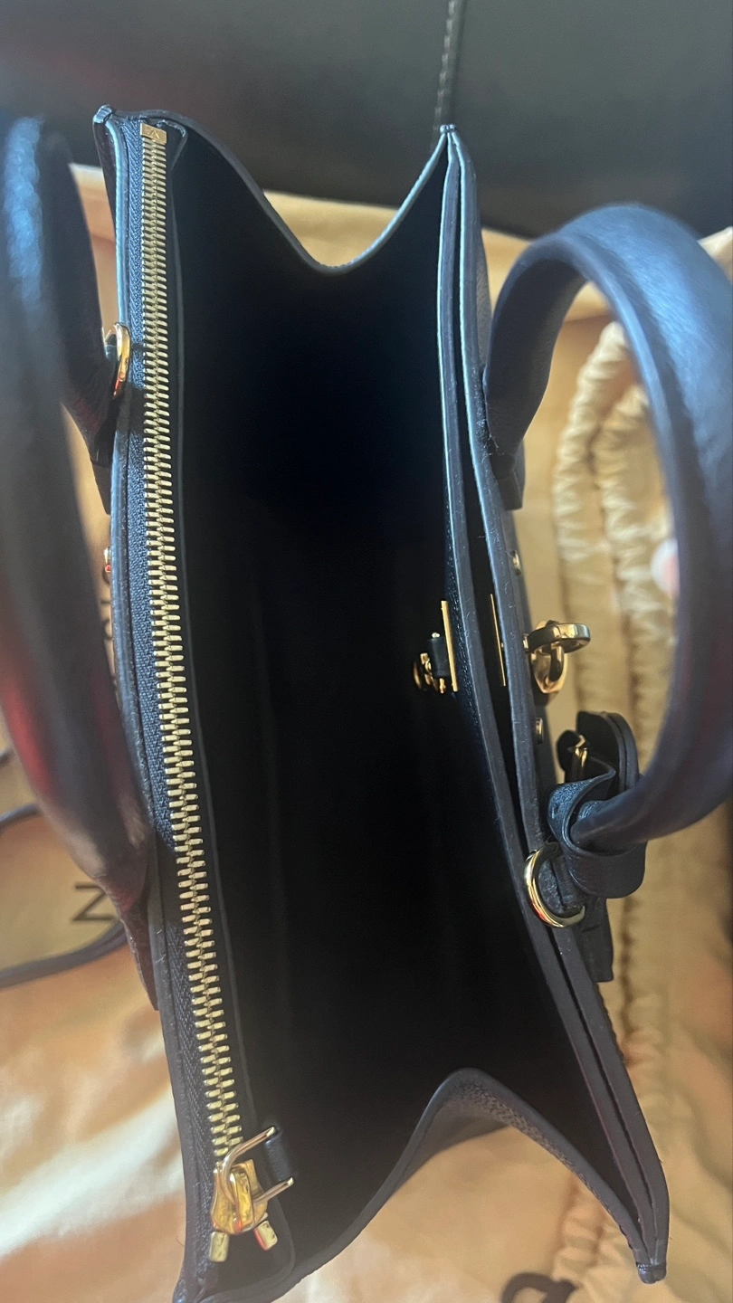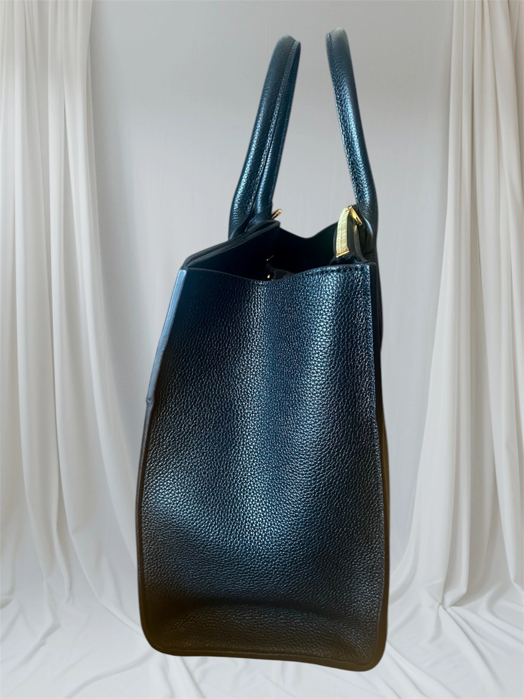 Black leather handbag. Top handles and detachable shoulder strap. Gold-tone hardware in pristine condition. Interior hardware still with the protective stickers, so no scratches.
