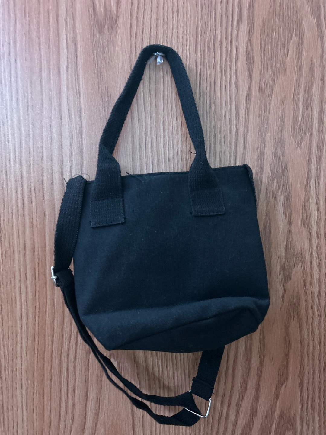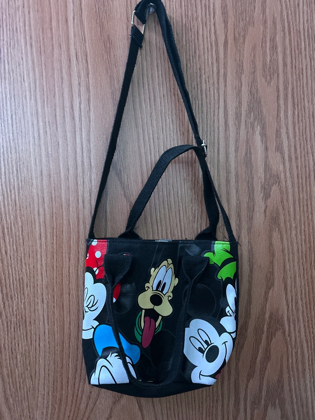 Adorable mini crossbody bag. Features various Disney characters. Black fabric with colourful cartoon images(mickey, goofy, etc.). Adjustable shoulder strap. Small size, perfect for kids.