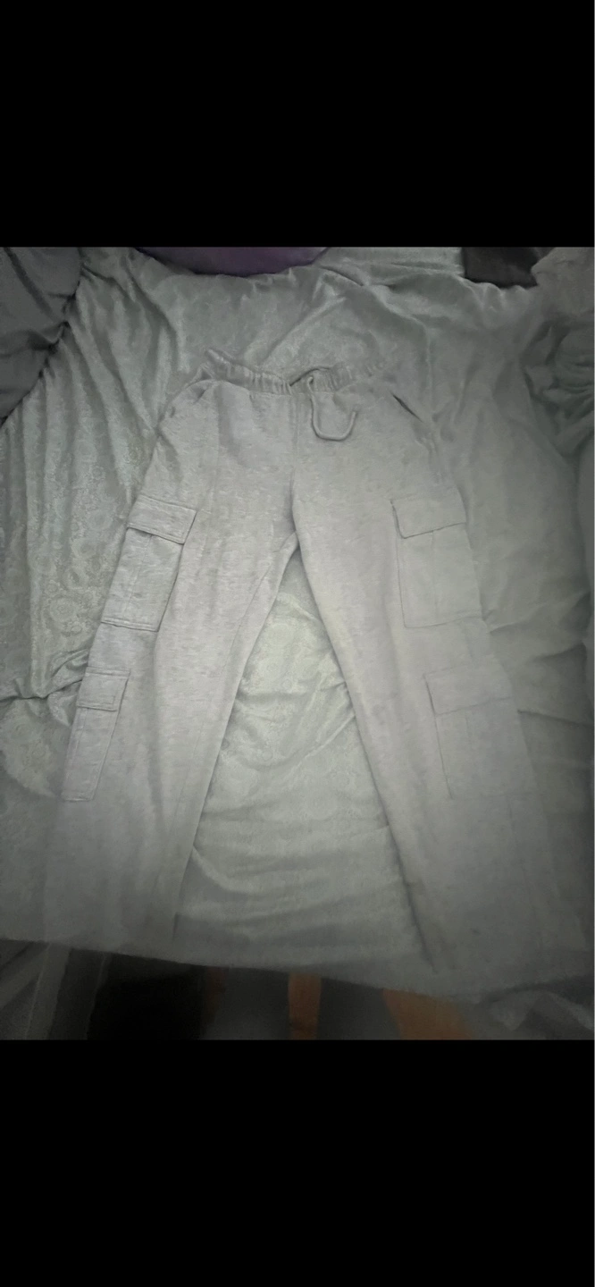 Grey sweatpants and matching hoodie. Drawstring waist. Multiple pockets. Relaxed fit. Great for lounging or casual wear.