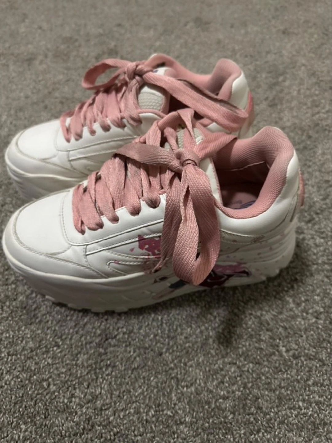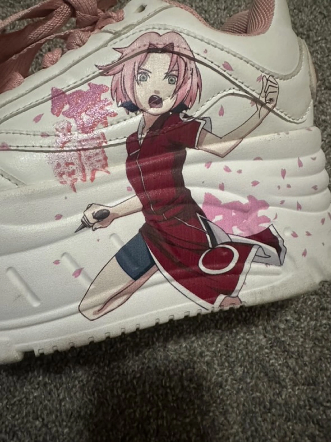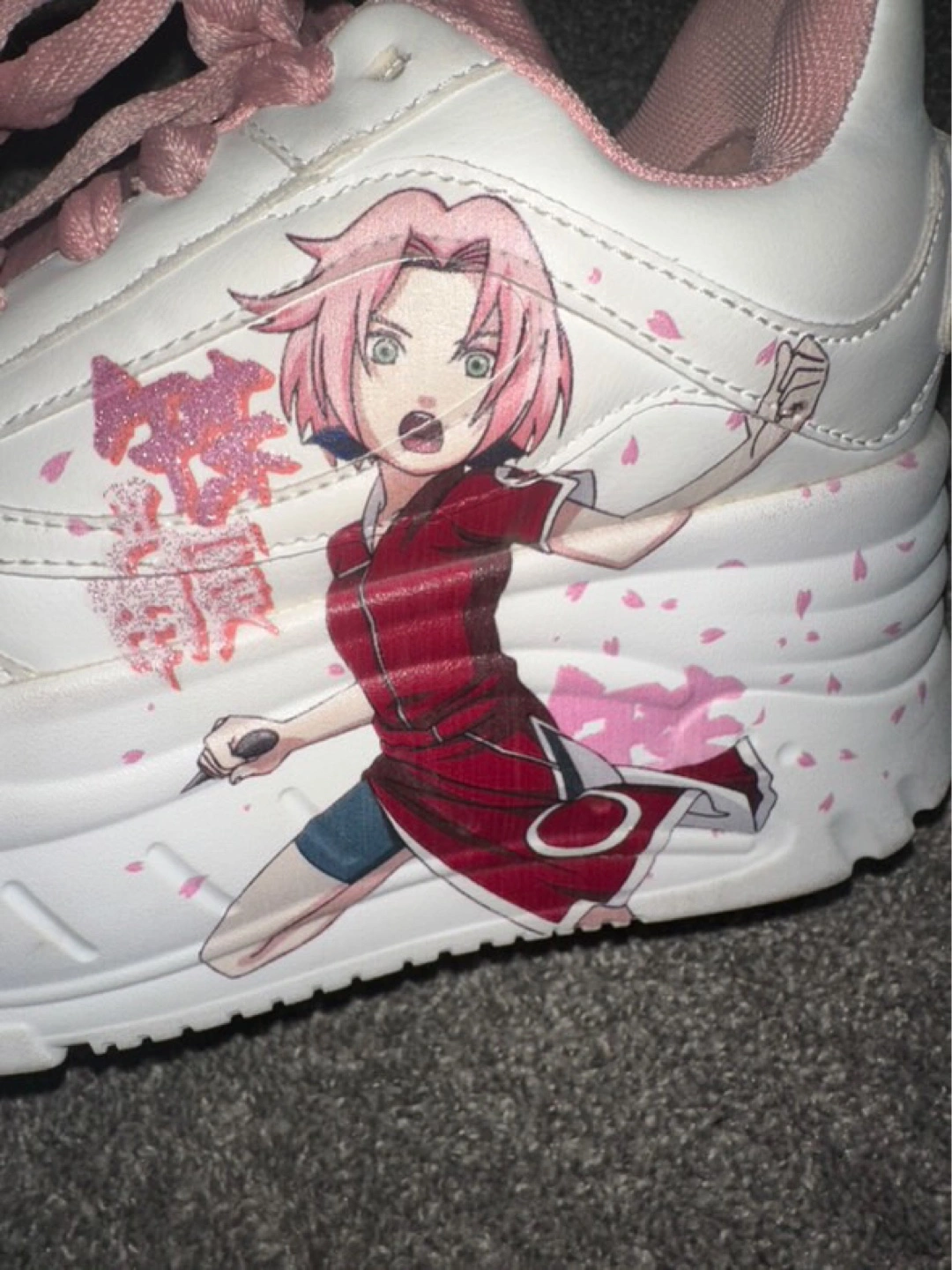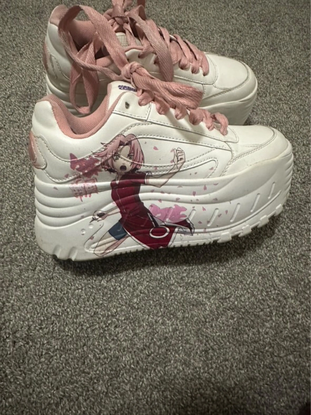 30Custom-designed platform sneakers. Feature Sakura Haruno from Naruto. Pink laces and accents. White base. Chunky sole.