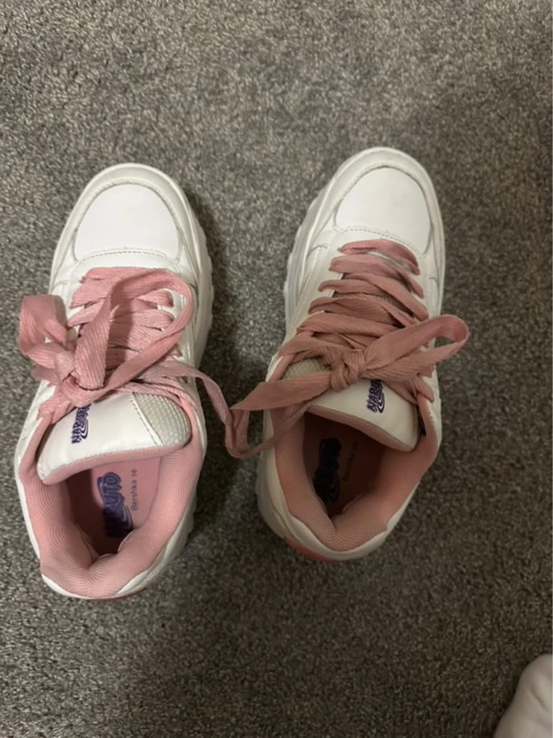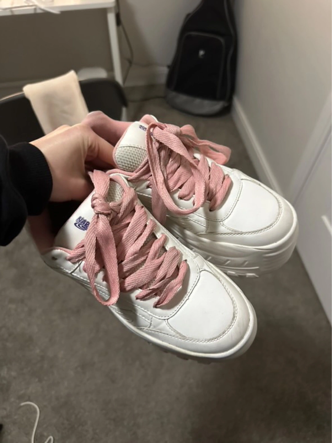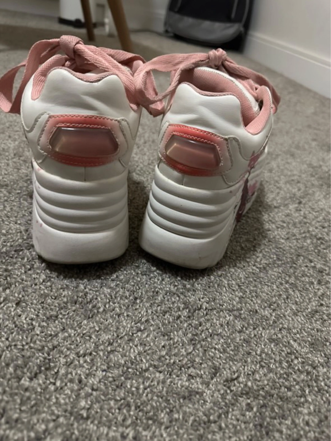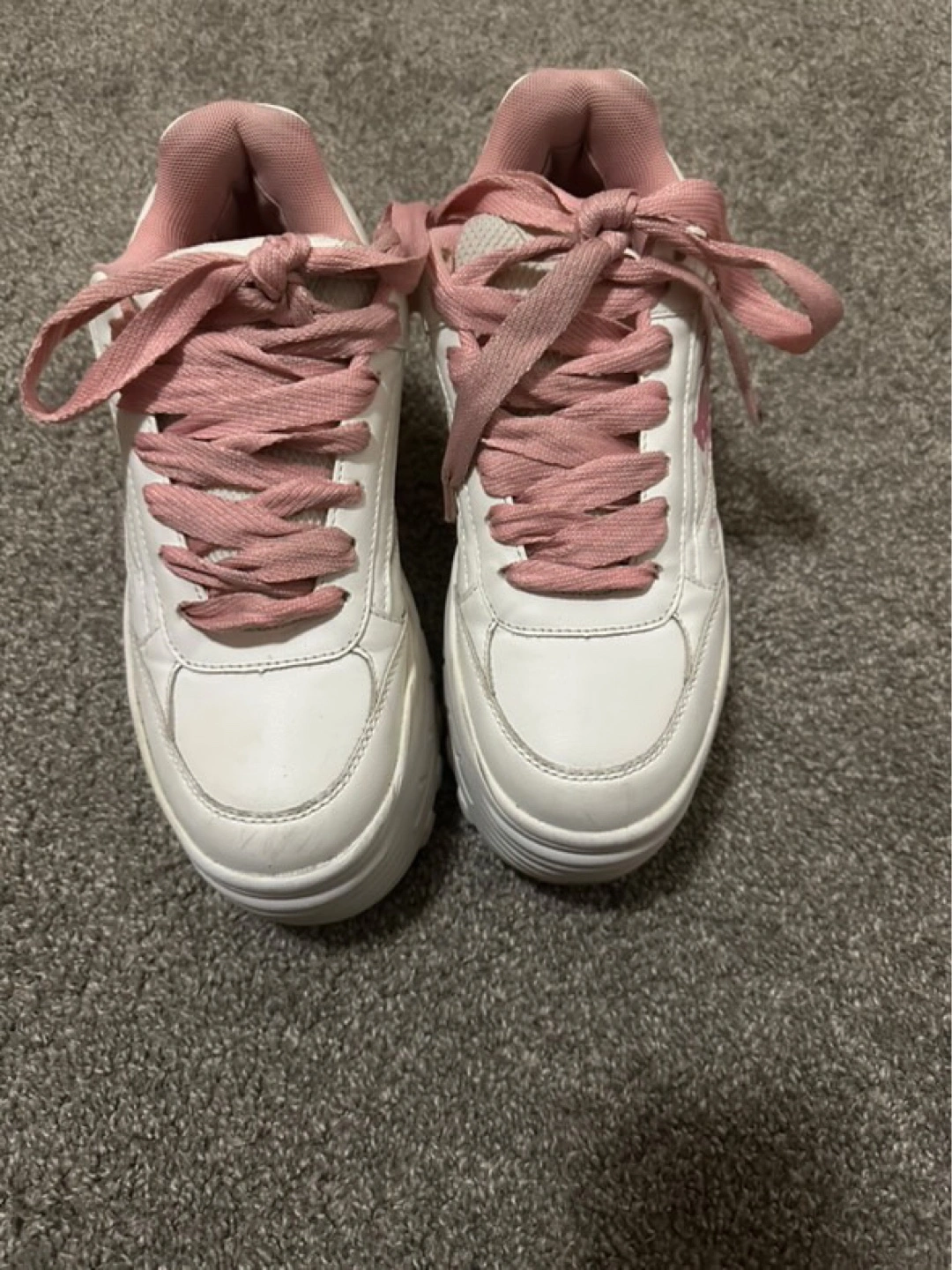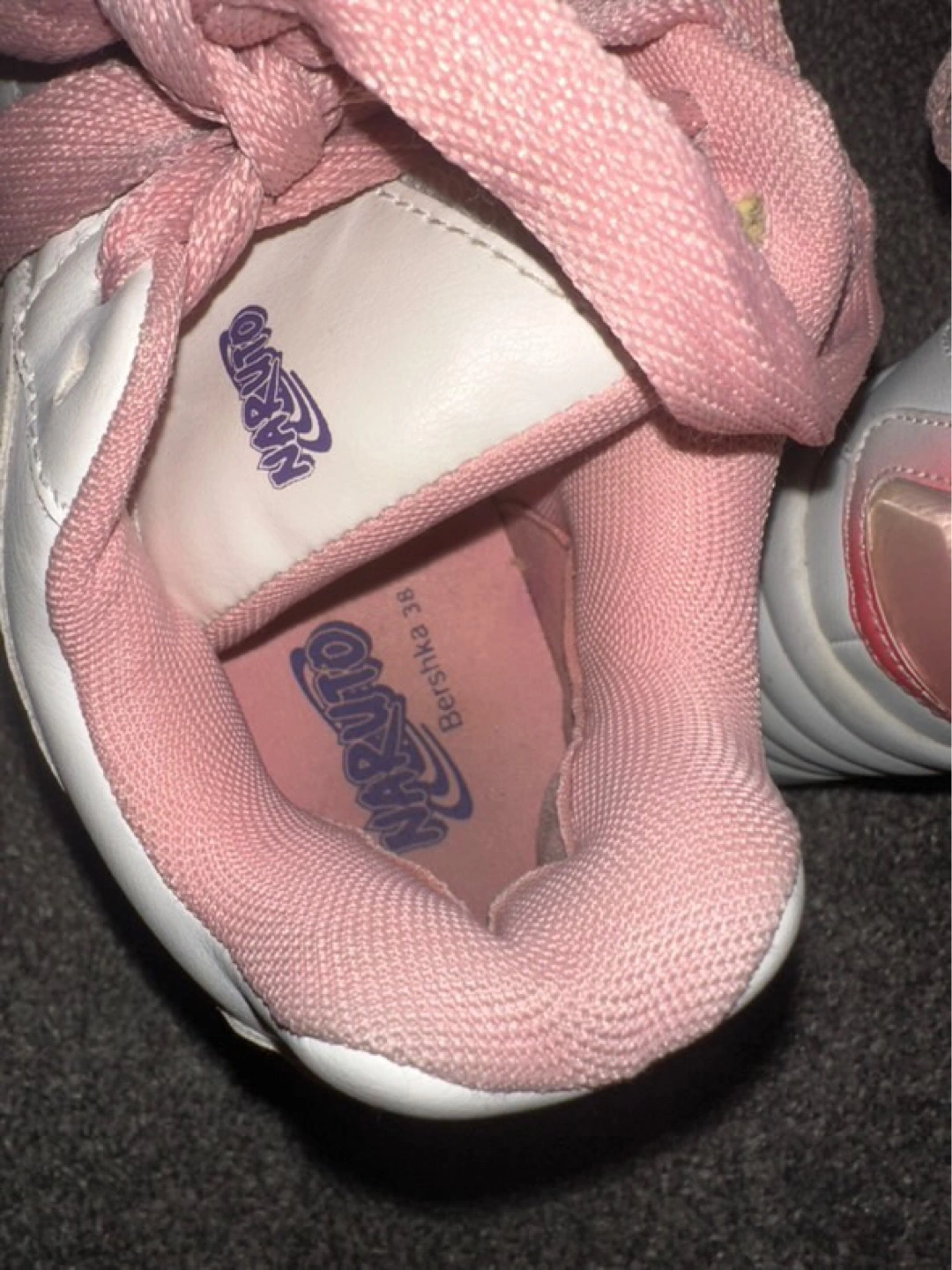 30Custom-designed platform sneakers. Feature Sakura Haruno from Naruto. Pink laces and accents. White base. Chunky sole.