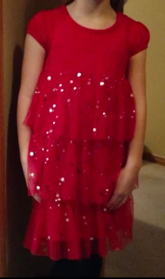 Fancy red tulle dress with sparkling sequins frilly skirt.