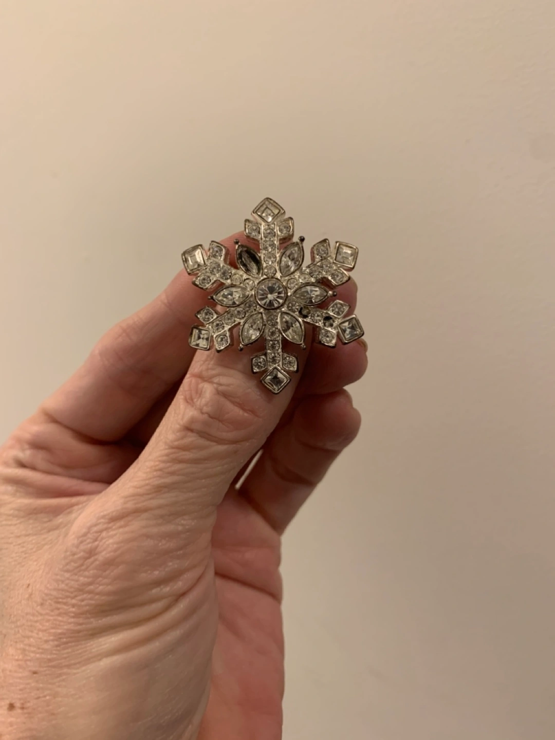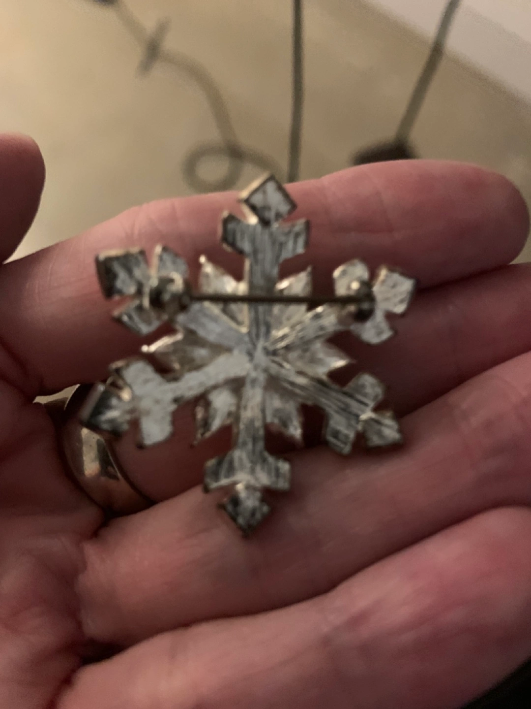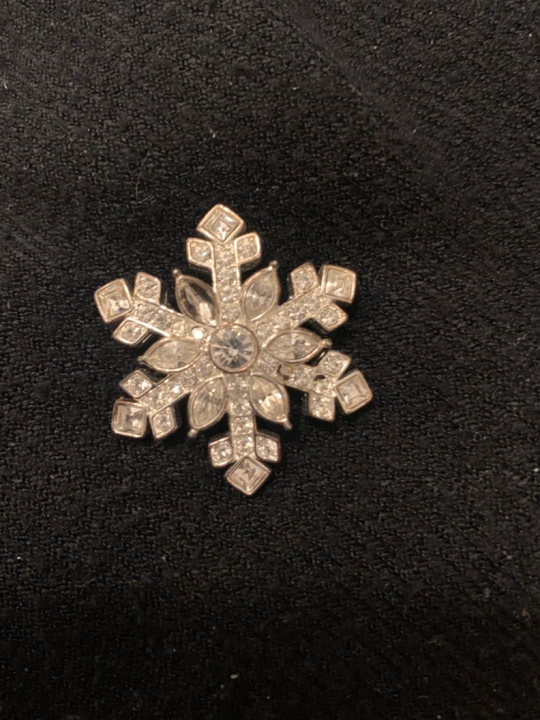 Snowflake pin with one stone missing. It’s really not noticeable because it’s sparkly and lovely.