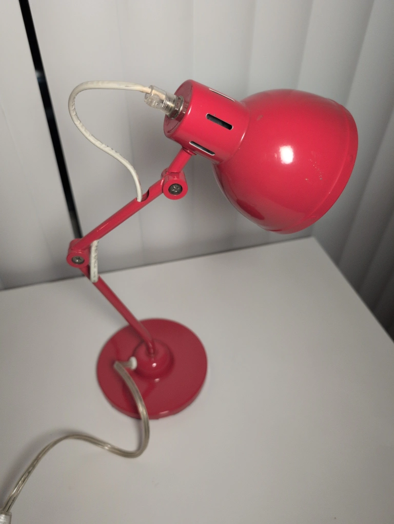 Red metal desk lamp. Adjustable arm and shade. Inline switch on cord. Great for a home office or student desk. Bulb NIT included.