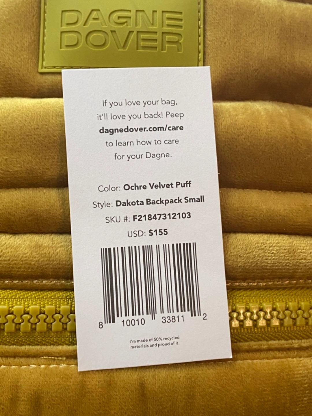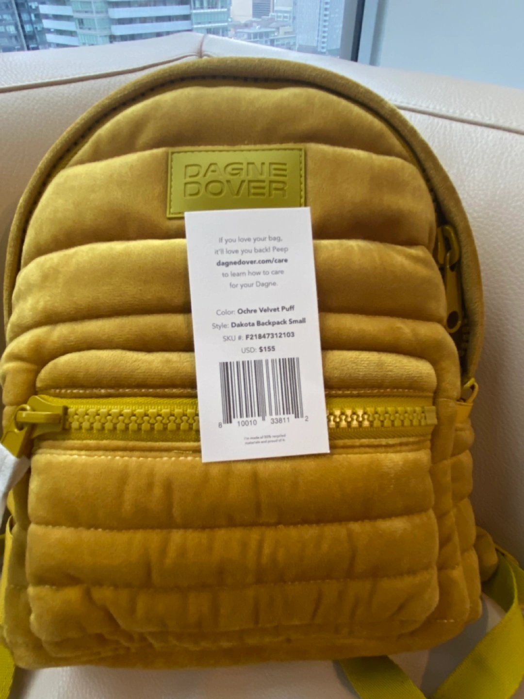 Mustard yellow quilted velvet backpack. Small size. Adjustable straps. Zipper closure. Brand new with tags.
