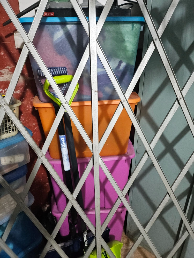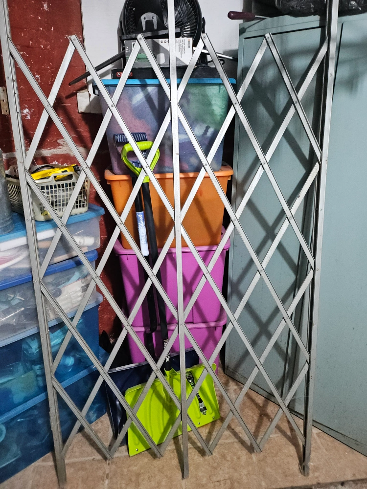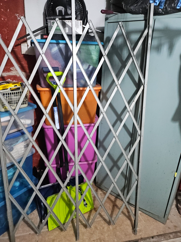 Expandable metal security gate. Good for storage units or other areas needing extra security. Grey metal construction. Some minor surface wear.