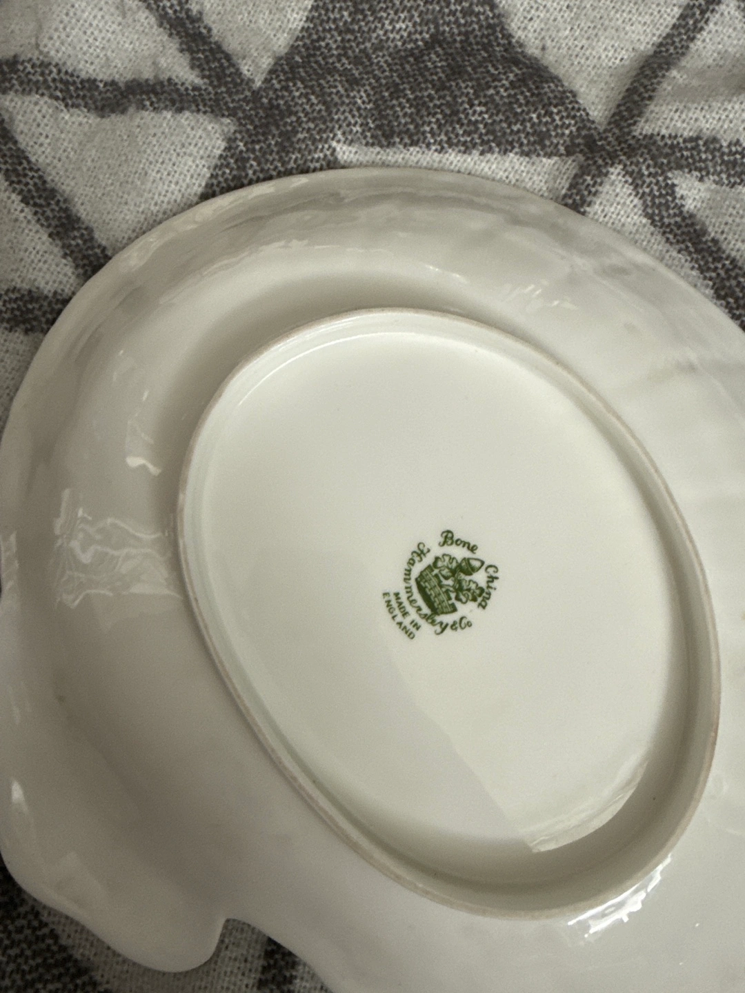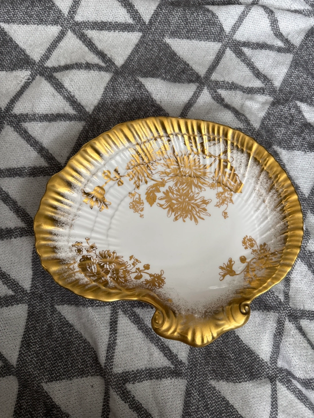 Beautiful vintage Royal Crown Derby shell-shaped dish. Gold detailing and floral pattern. Made in England. Collectible piece. Bone China