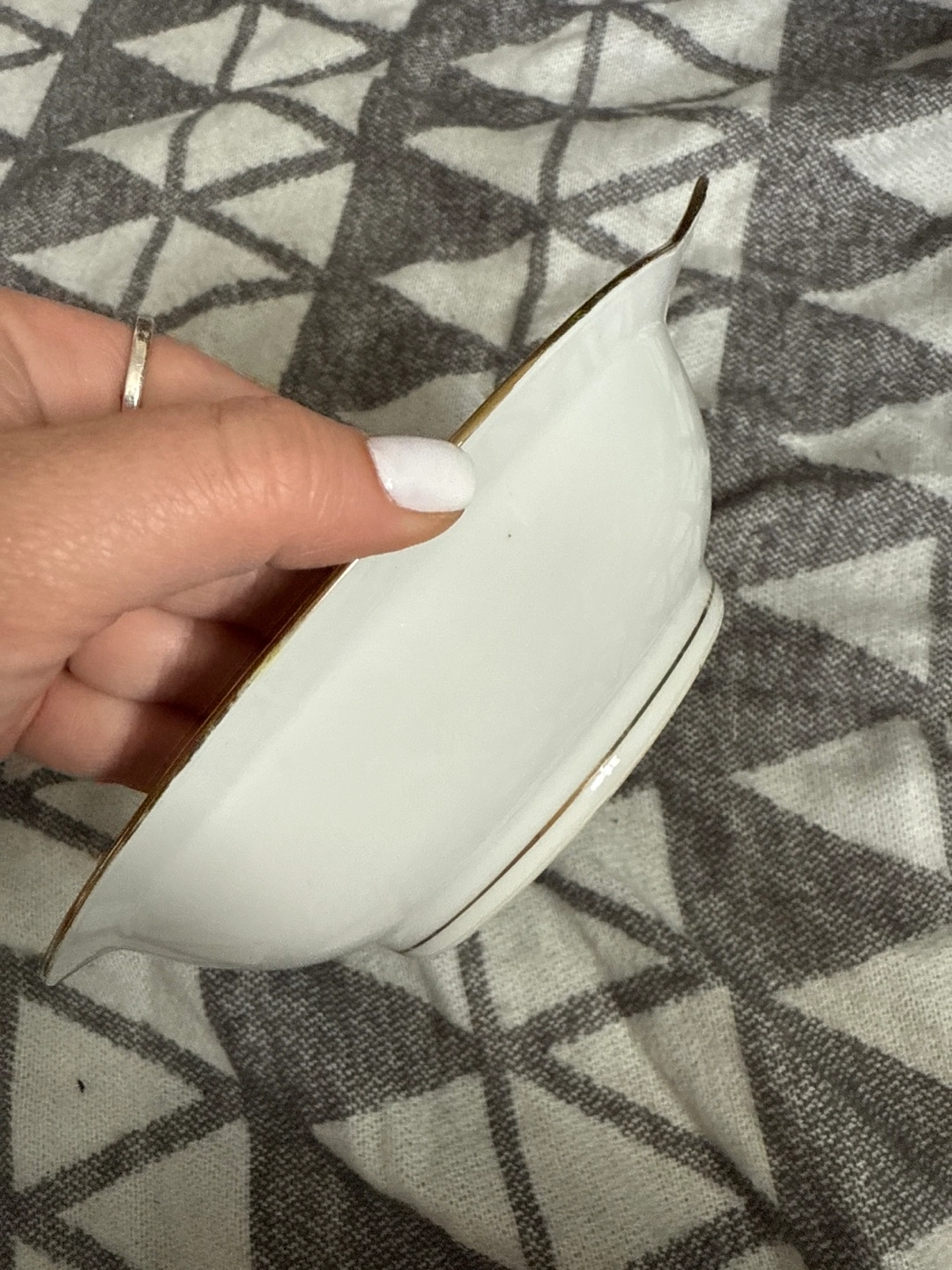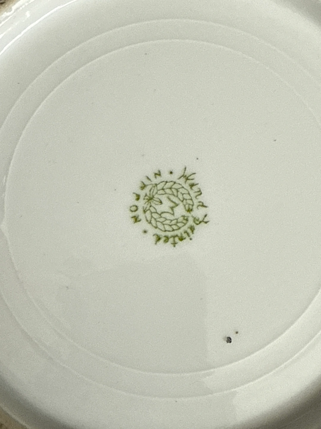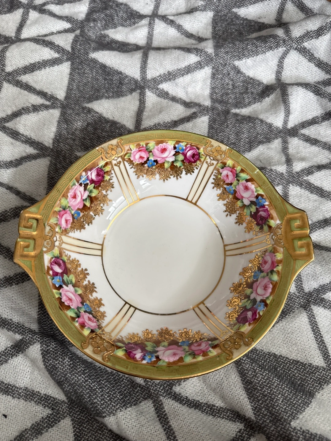 Beautiful antique porcelain bowl. Features a floral design with roses and gold accents. Green band around the rim. Two handles. Shows some age.