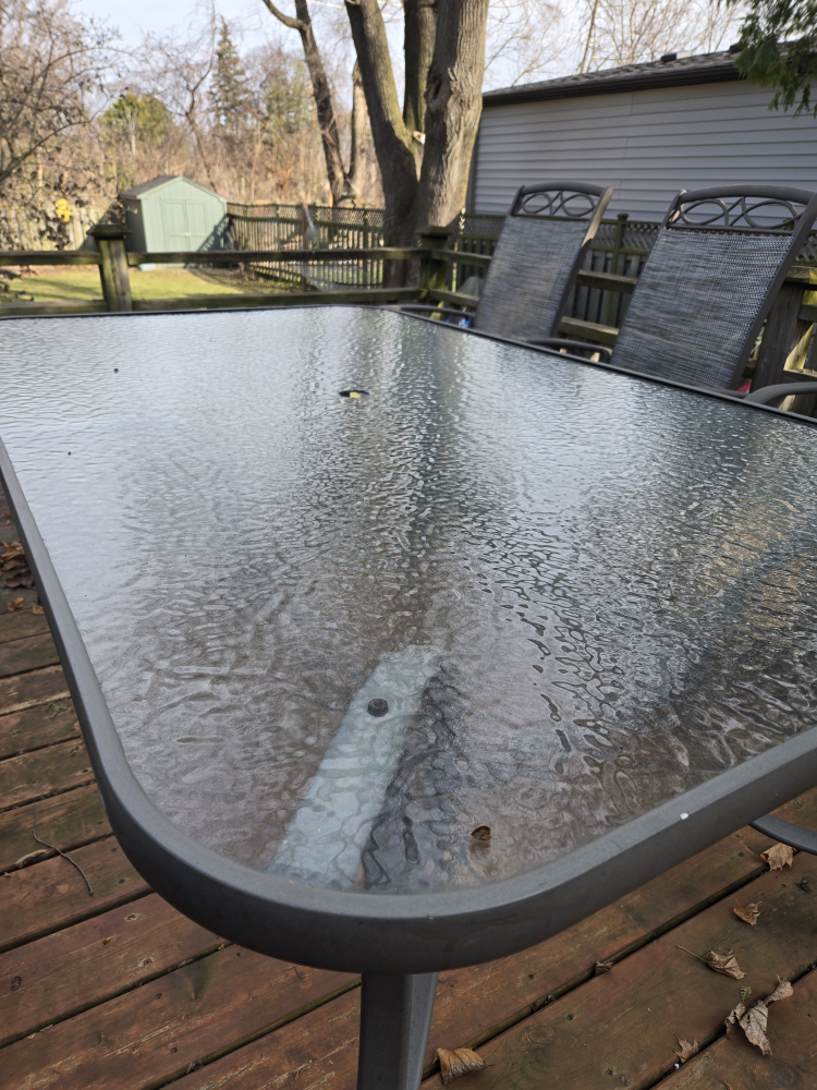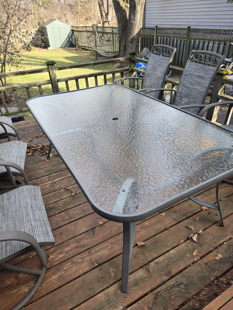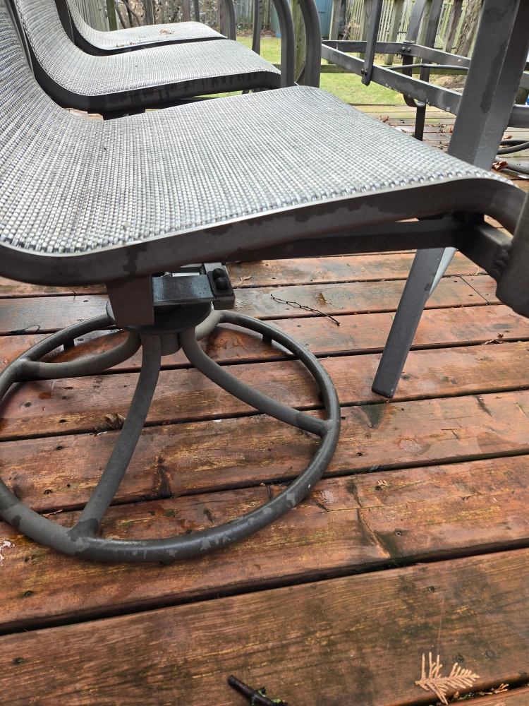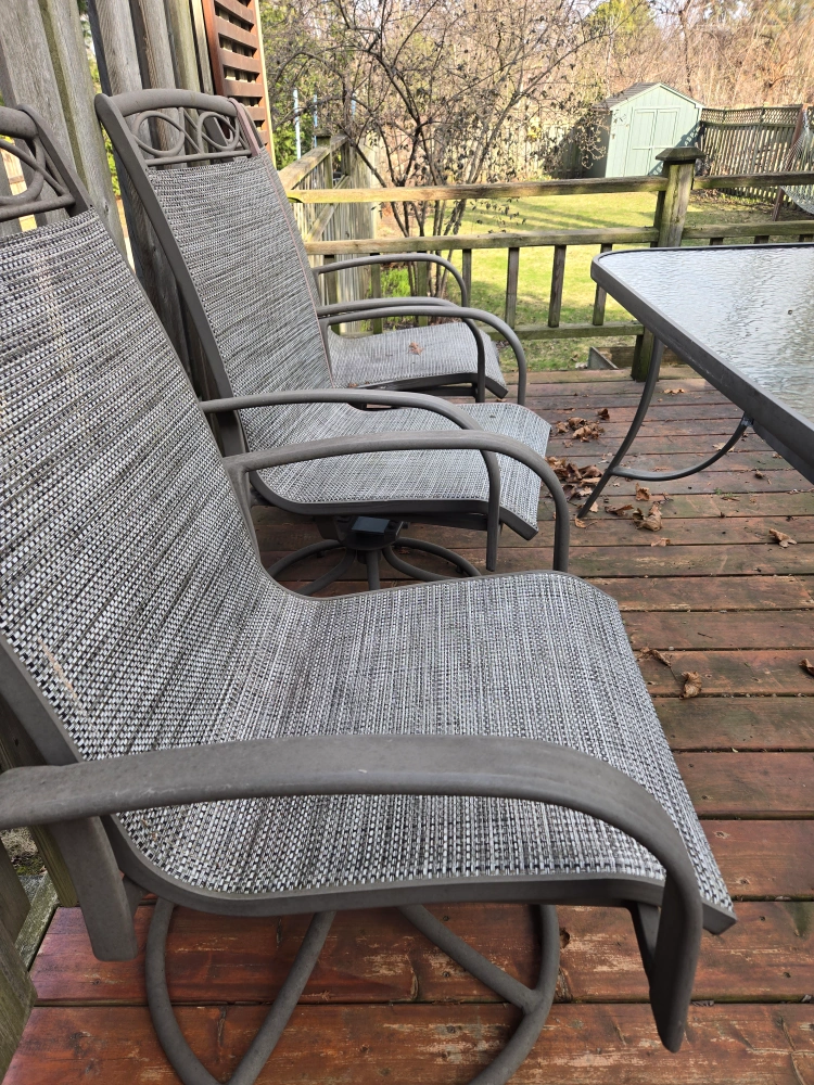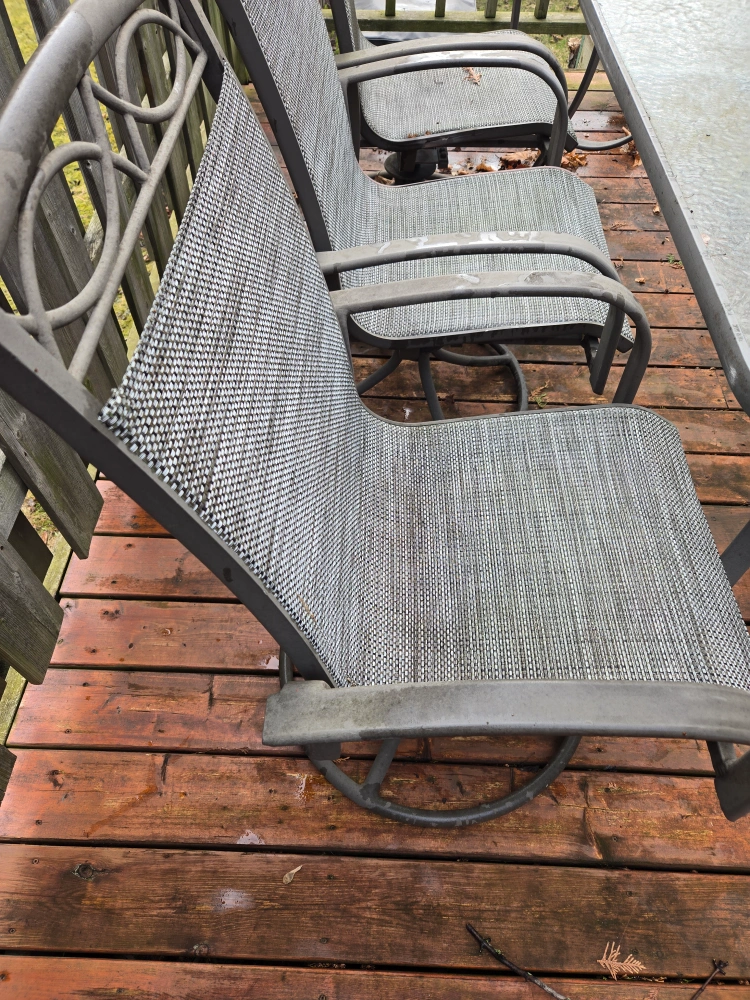 Metal frame patio furniture. Six swivel chairs with grey sling seats. Rectangular glass-top table. Some wear from outdoor use. Perfect for your deck or patio. Table is 6 by 3.5 ft.