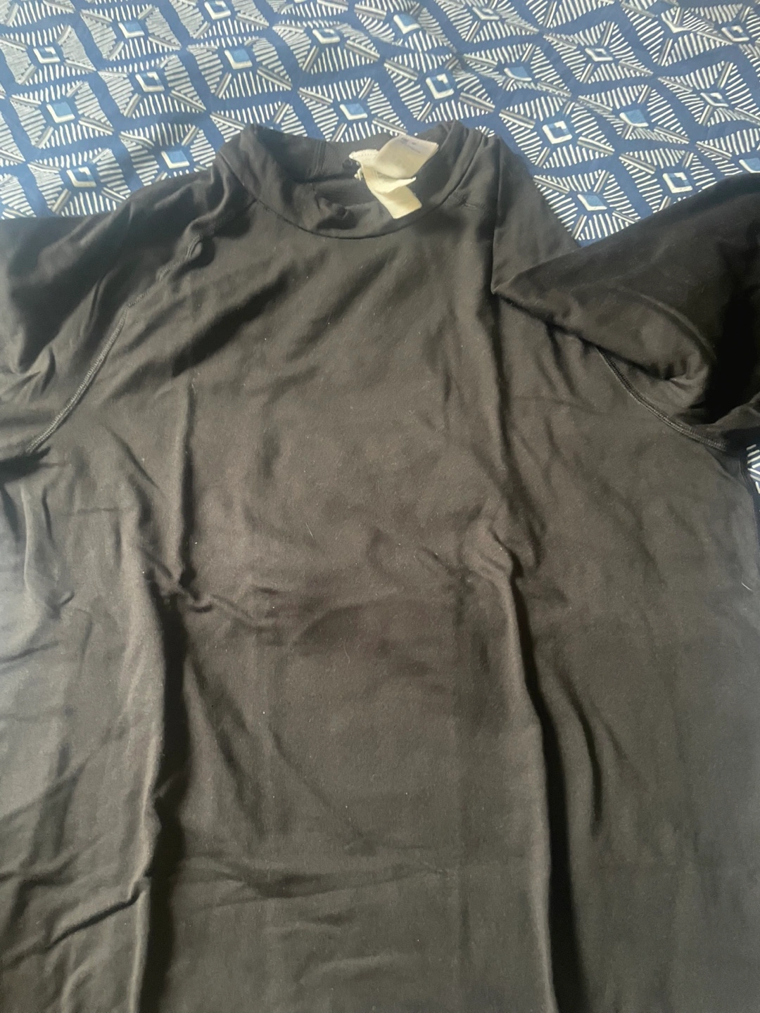Men's 2 black long sleeve mock neck shirt. Size XL. Made of a comfortable, stretchy material. Great for layering or wearing on its own.
