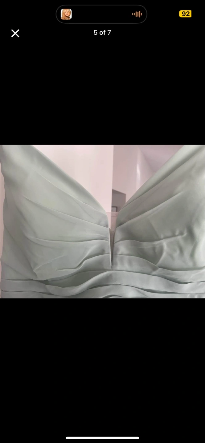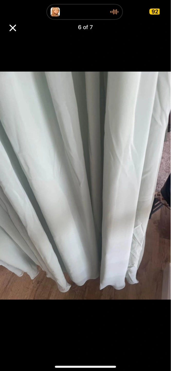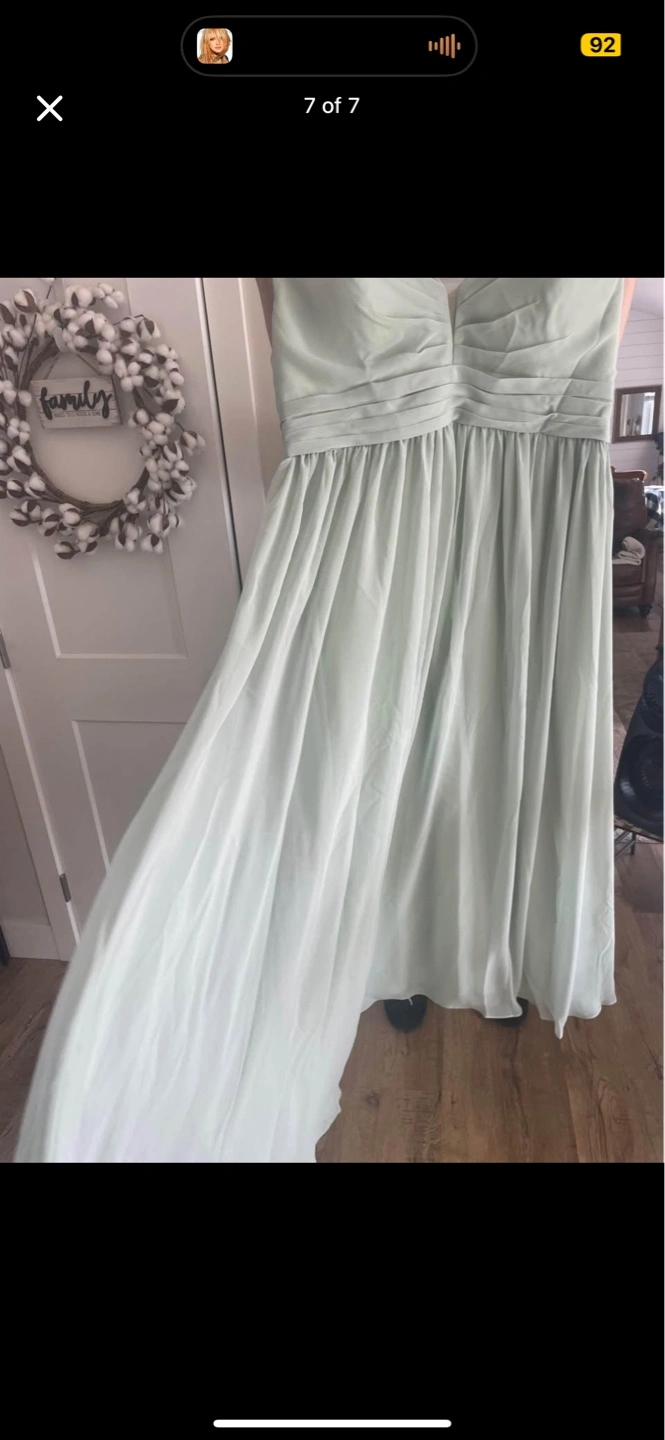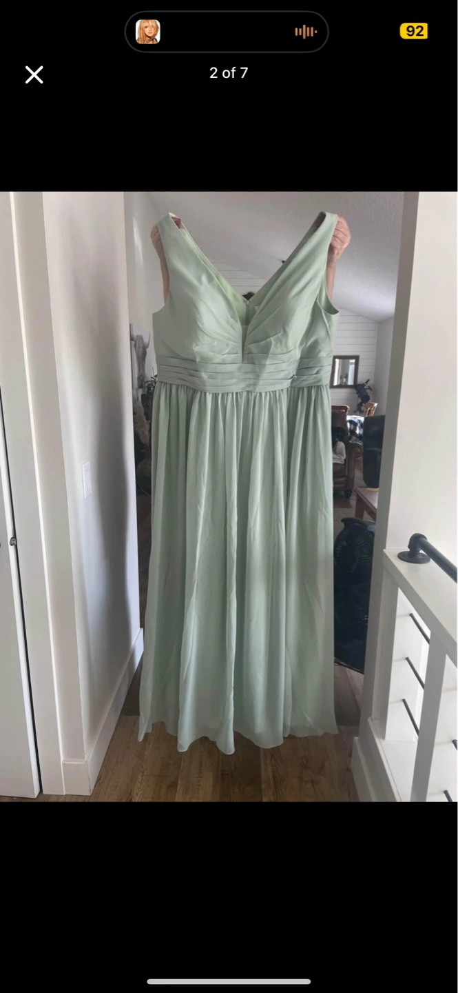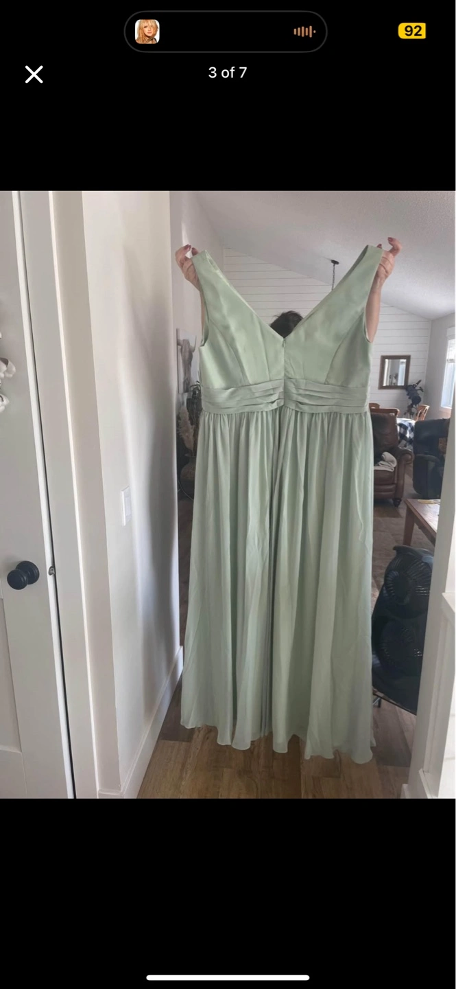 Sage green maxi dress. V-neck, sleeveless. Flowy chiffon fabric. Floor-length. Perfect for a wedding or special occasion.