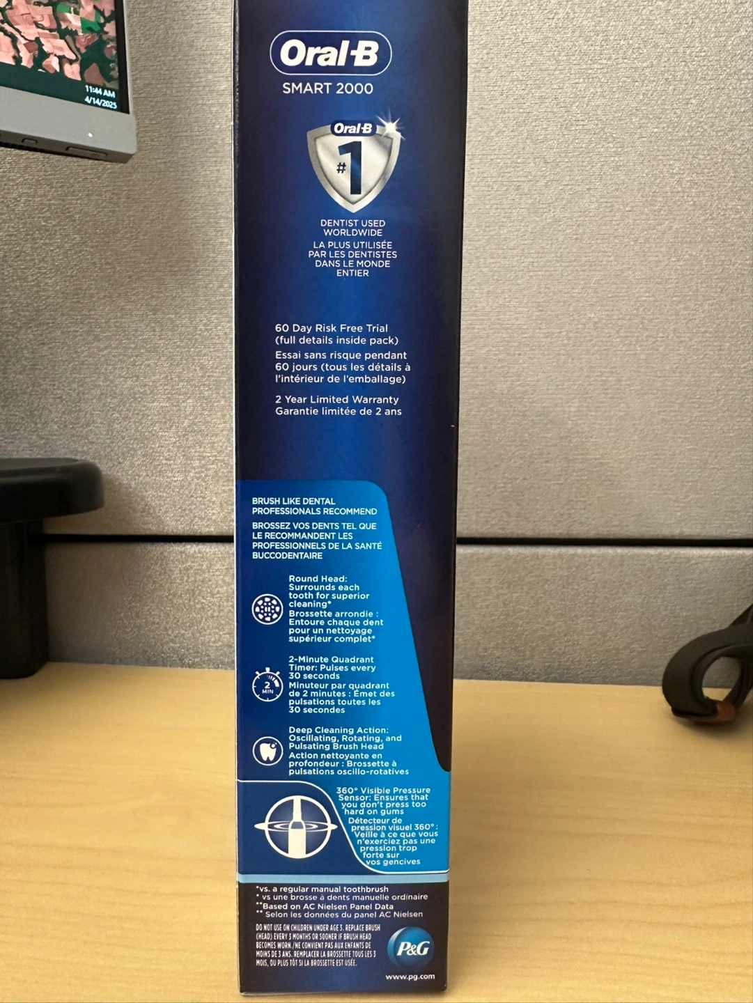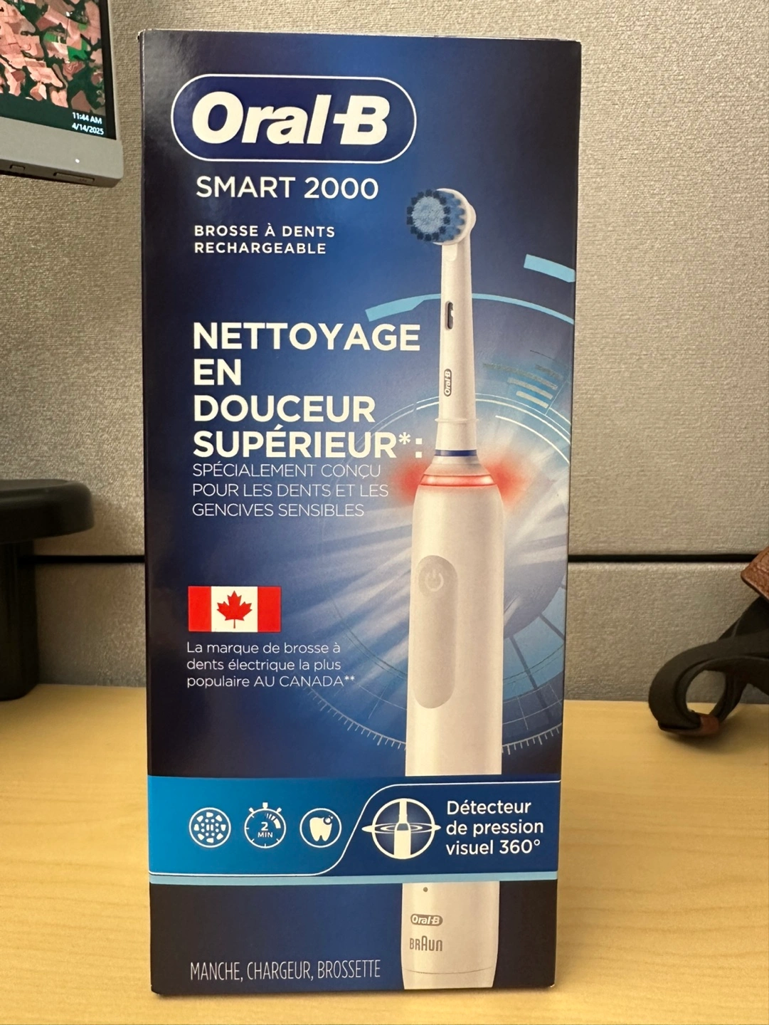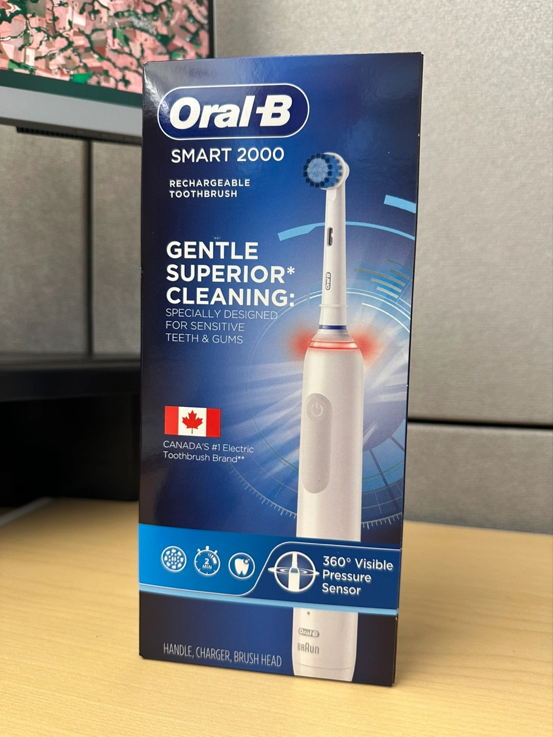 New Oral-B Smart 2000 electric toothbrush. Features a 360° visible pressure sensor. Includes handle, charger, and brush head. Gentle superior cleaning, specially designed for sensitive teeth and gums. Dentist-used brand.
