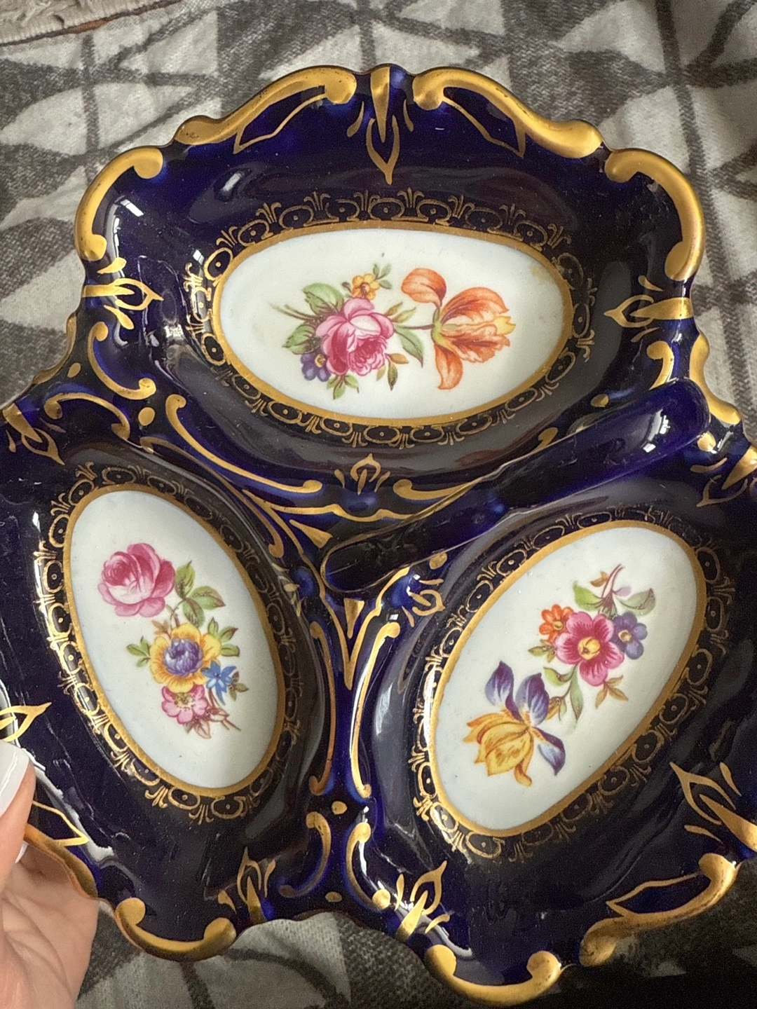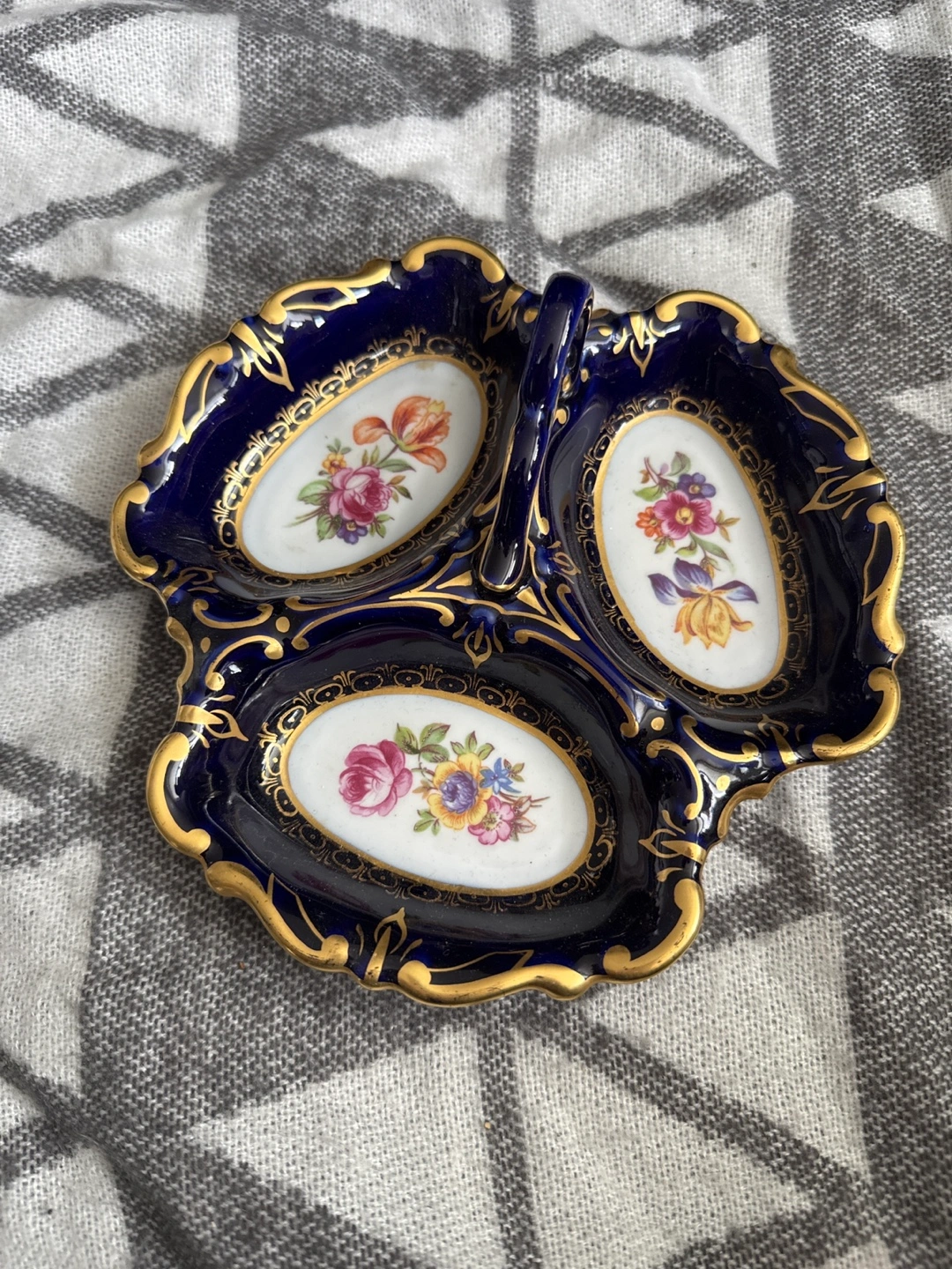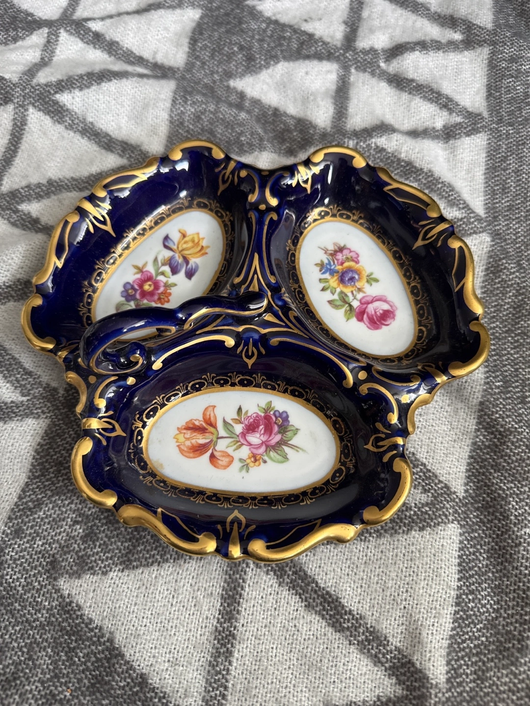 Three-compartment trinket dish. Cobalt blue with gold detailing. Floral accents. Made in Germany. JLMENAU Echt Kobalt. Triple dish server with handle. East Germany. Henneberg. Candy dish. Cobalt blue dish. Nut dish. Relish dish. Numbered.