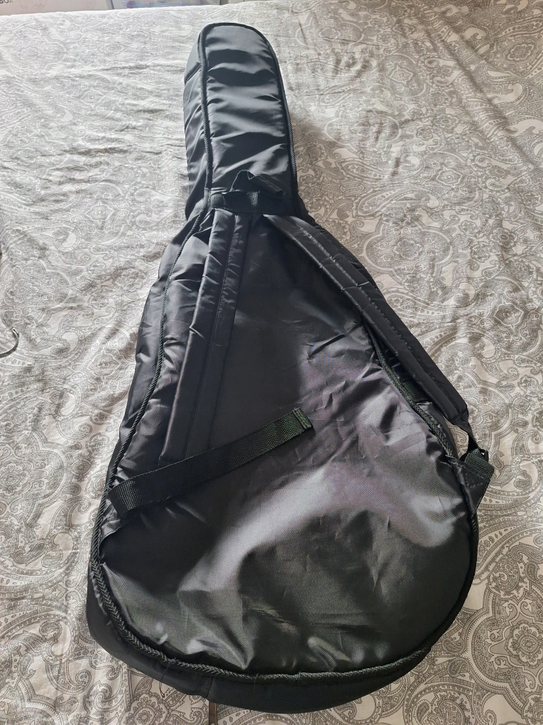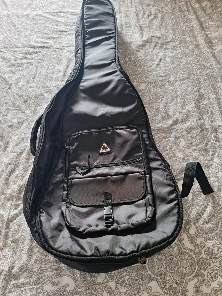 BOULDER Black padded gig bag for acoustic guitar. Features backpack straps and a small front pocket. Zipper closure. Excellent for transport and storage.