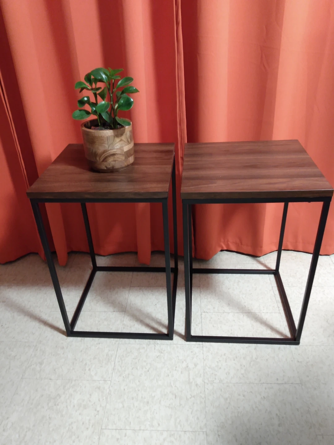 faux walnut wood and black metal side tables. Used for a few months. Free of scratches and nicks from a smoke and pet free home. FIRM PRICE.