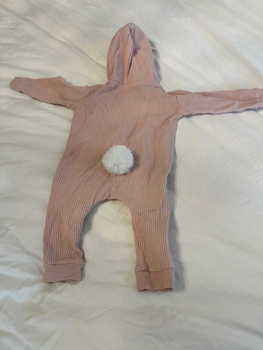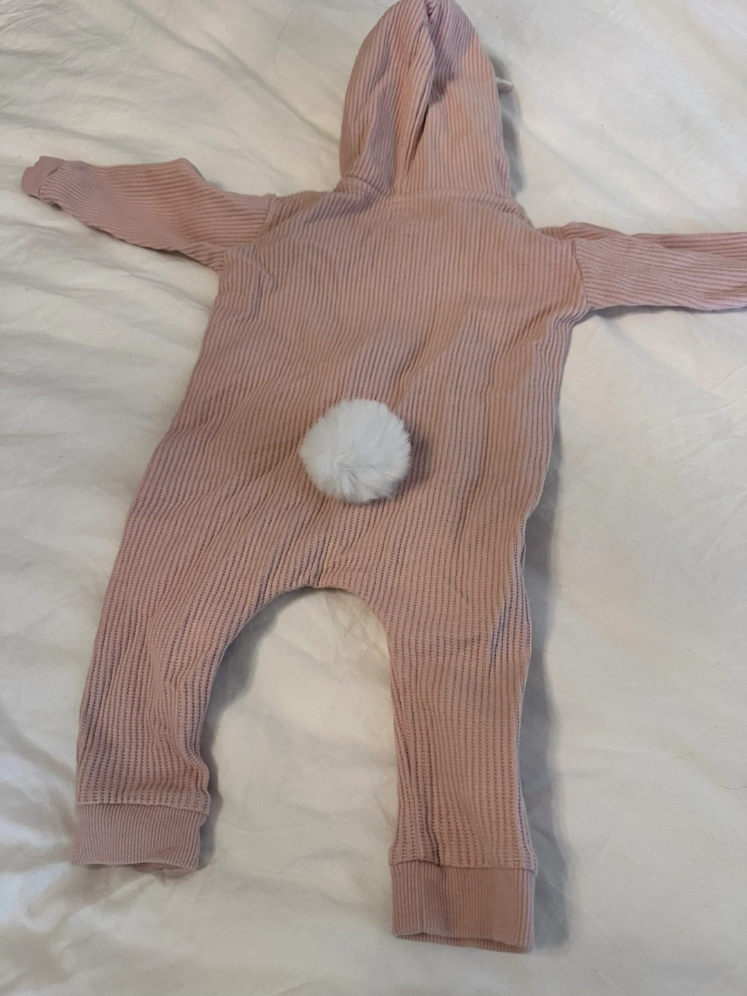 Sweet baby romper, pink colour. Features a bunny hood with ears and a fluffy white tail. Zip closure. Cozy and comfortable material.