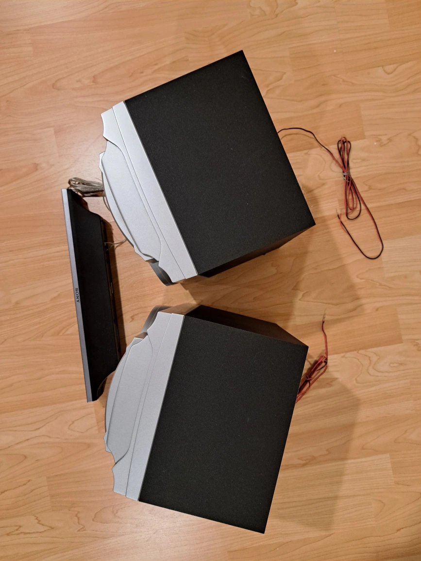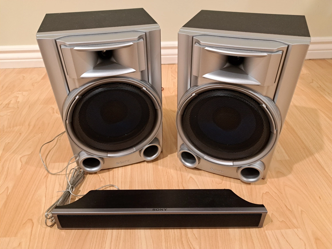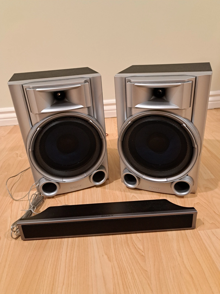 Sony speaker system. Two bookshelf speakers and a subwoofer. Good condition. Includes connecting wires.