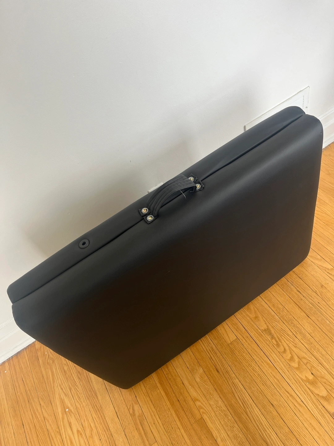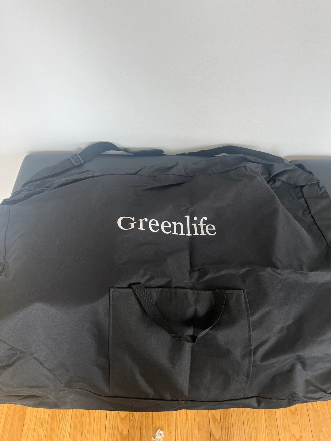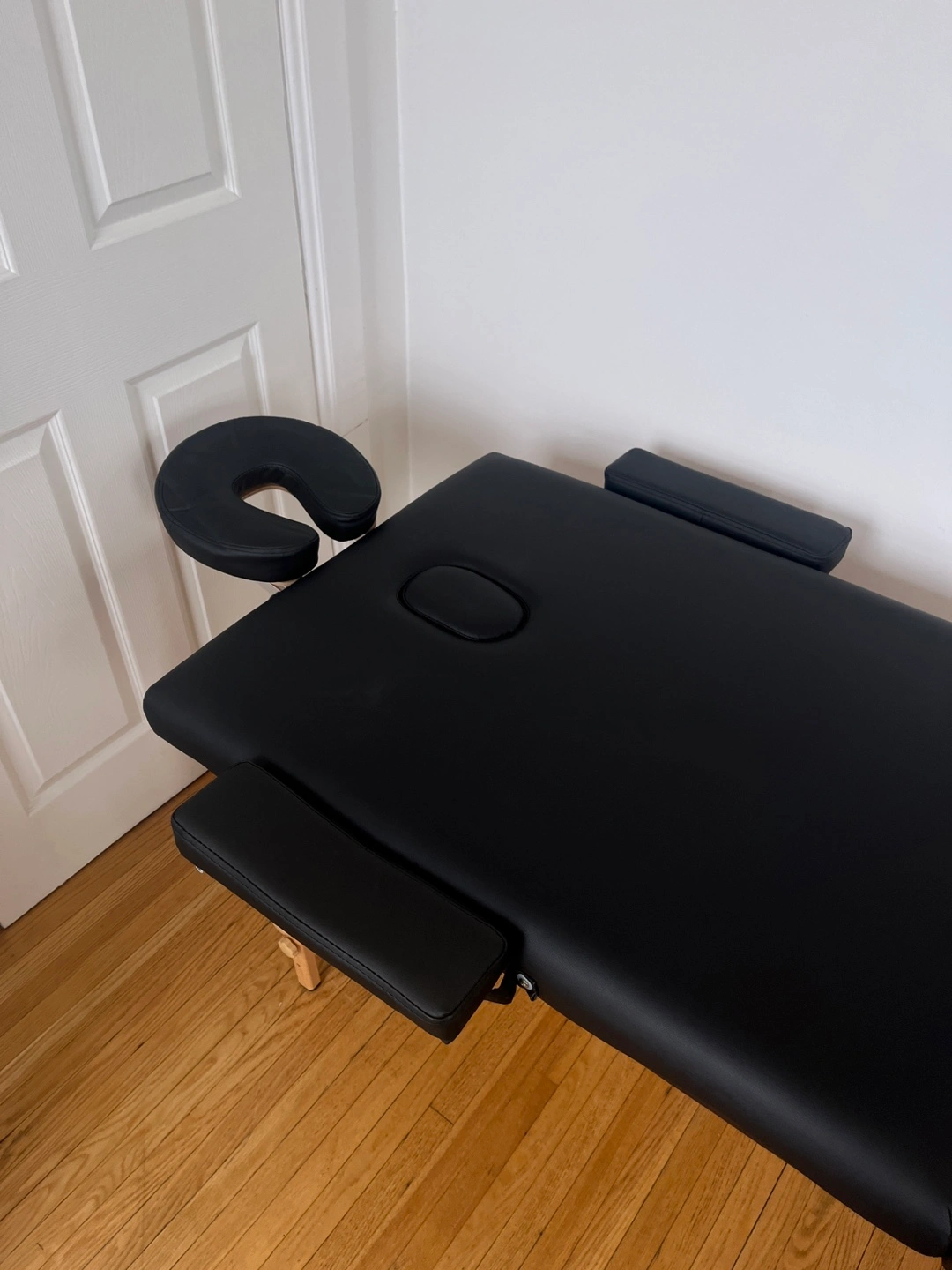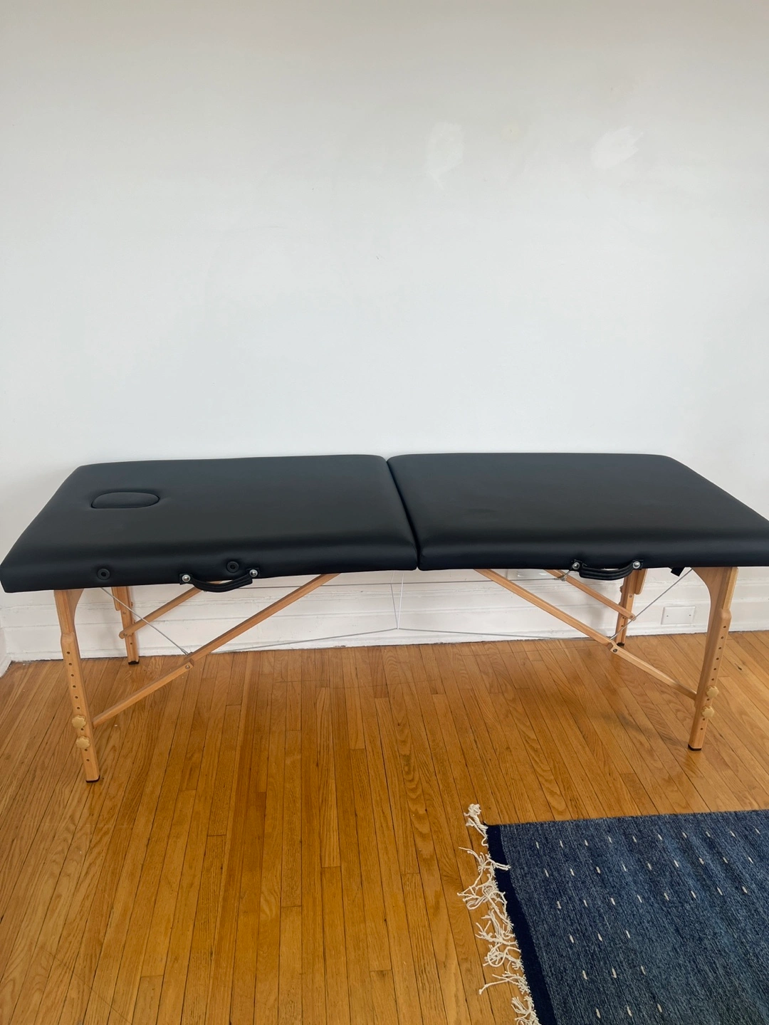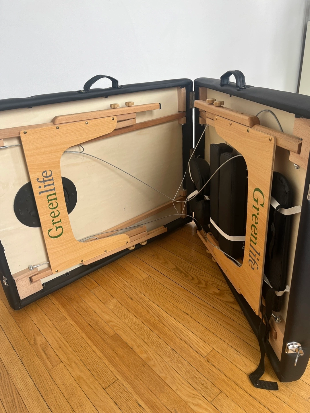 272Black massage table, wooden frame, includes carrying case and accessories (face cradle and arm rests). Folds easily for storage and transport. Excellent condition. Dimensions (L x W): 73” x 28” With face cradle and arm rests: 84” x 36” Folded (or in bag): 36” x 28”