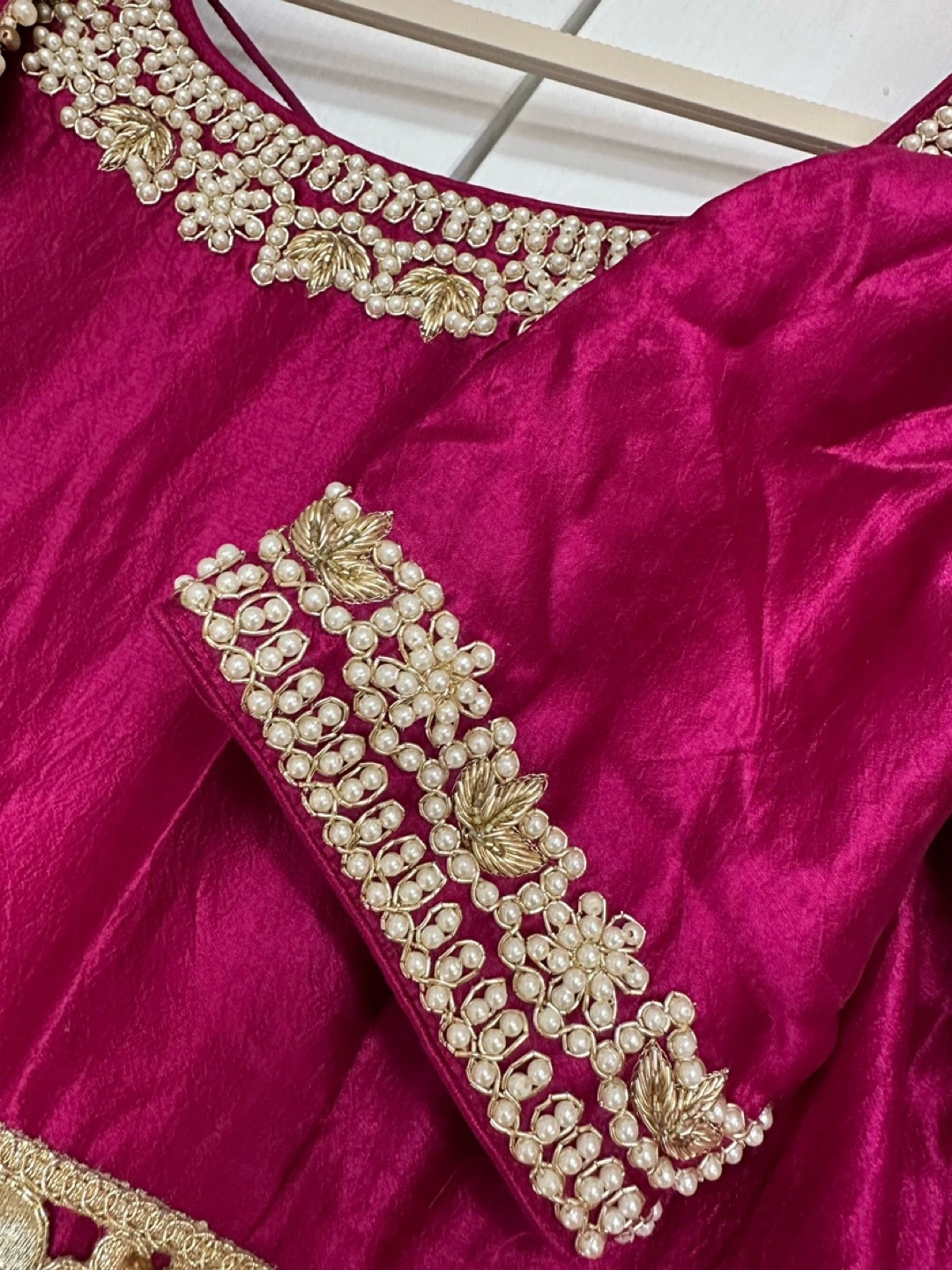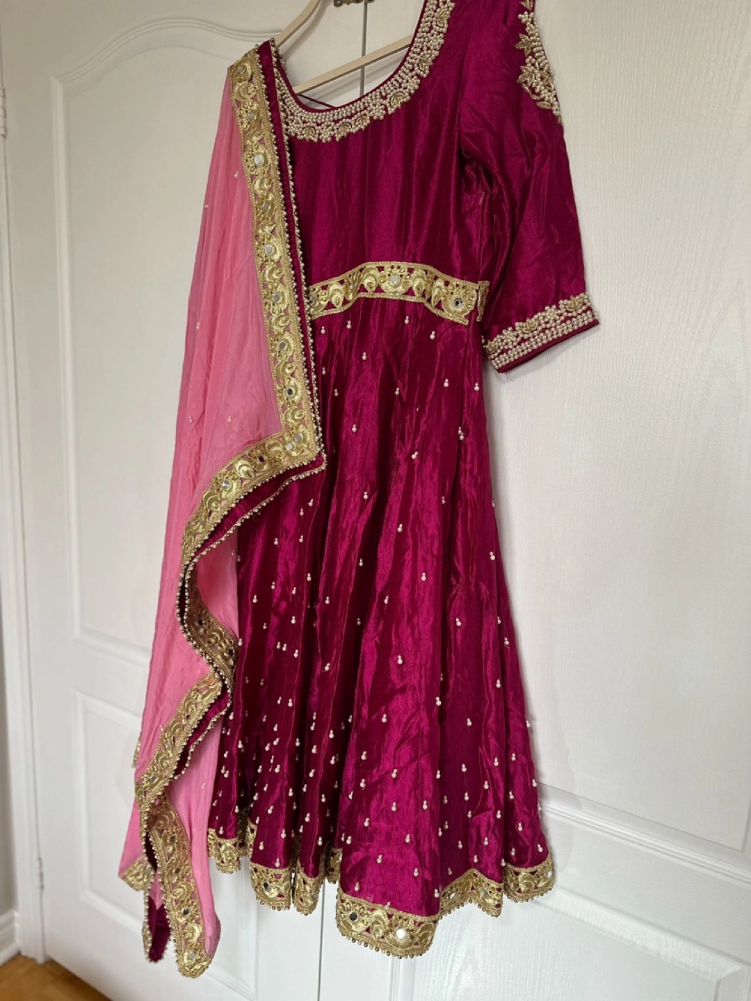9Beautiful magenta-coloured Pakistani shalwar kameez. Features intricate gold and pearl embroidery. Comes with a matching pink dupatta. Elegant and festive attire.