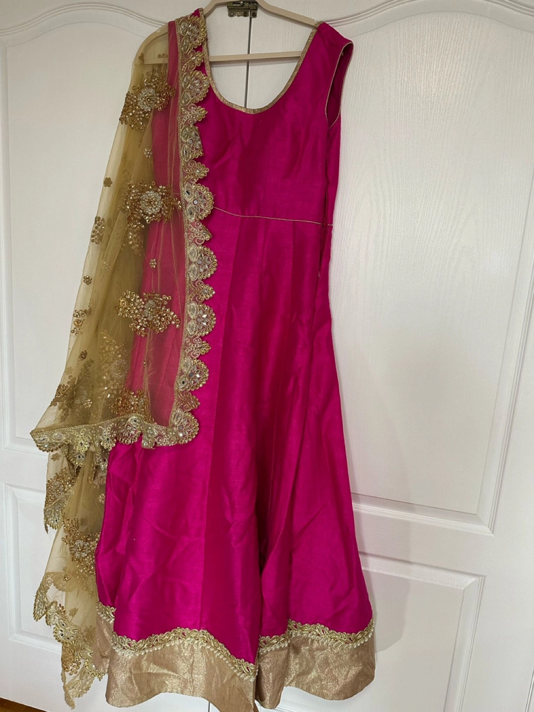 9Beautiful pink salwar kameez. Features gold embroidery and embellishments. Includes matching dupatta. Sleeveless design. Floor-length.